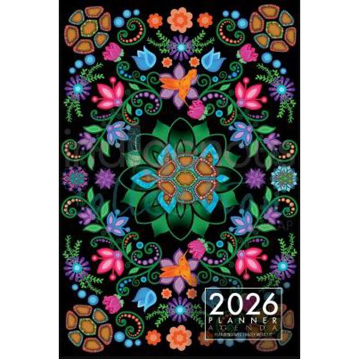 Agenda 2026 bilingue présentant des œuvres de Tracey Metallic; une artiste peintre autochtone