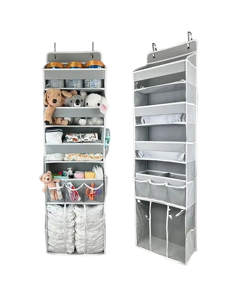 Avec son design épuré et sa couleur neutre, le BabySpace Organizer s’adapte facilement à n’importe quelle décoration de chambre ou espace de rangement. Il peut être suspendu derrière une porte, sur une étagère ou accroché à un lit grâce à ses crochets robustes. Sa conception intelligente assure une stabilité optimale, même lorsqu’il est complètement rempli.