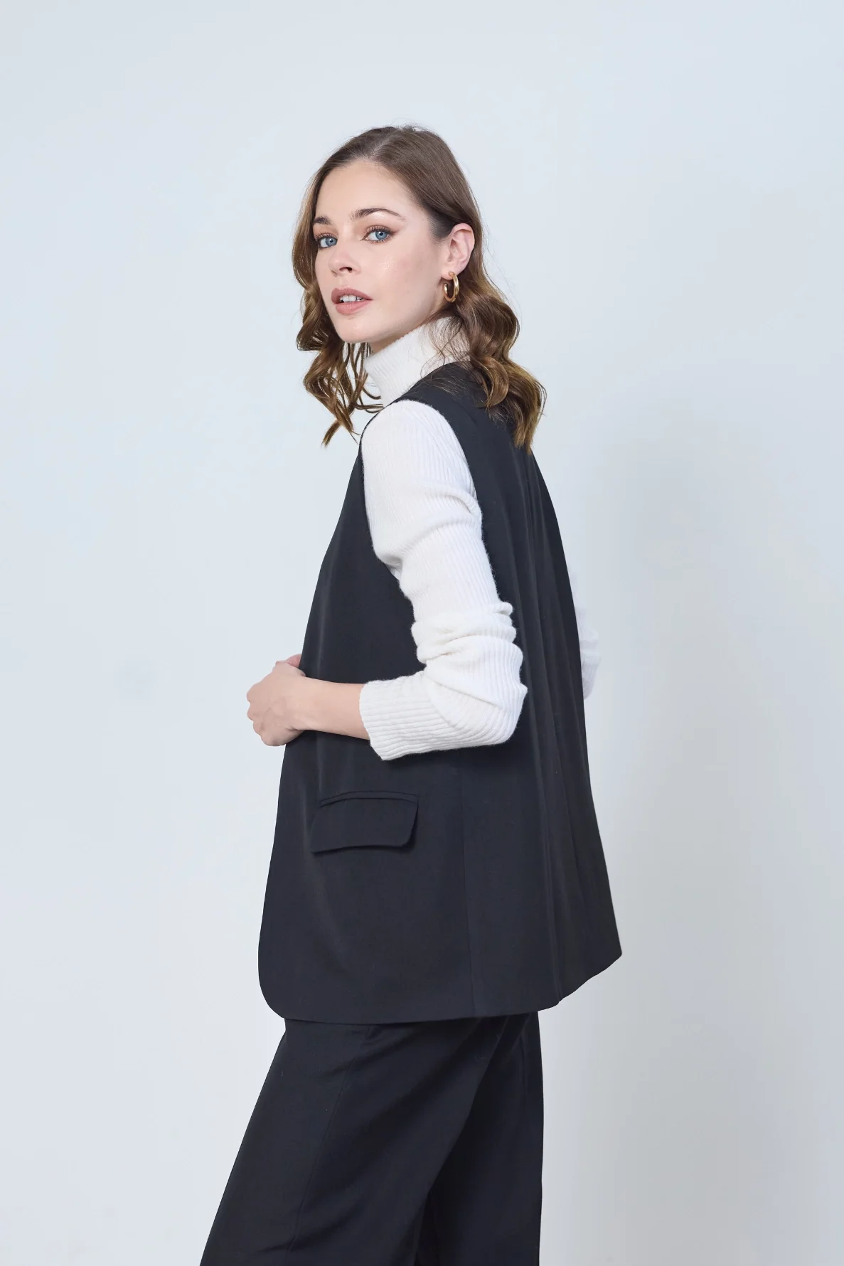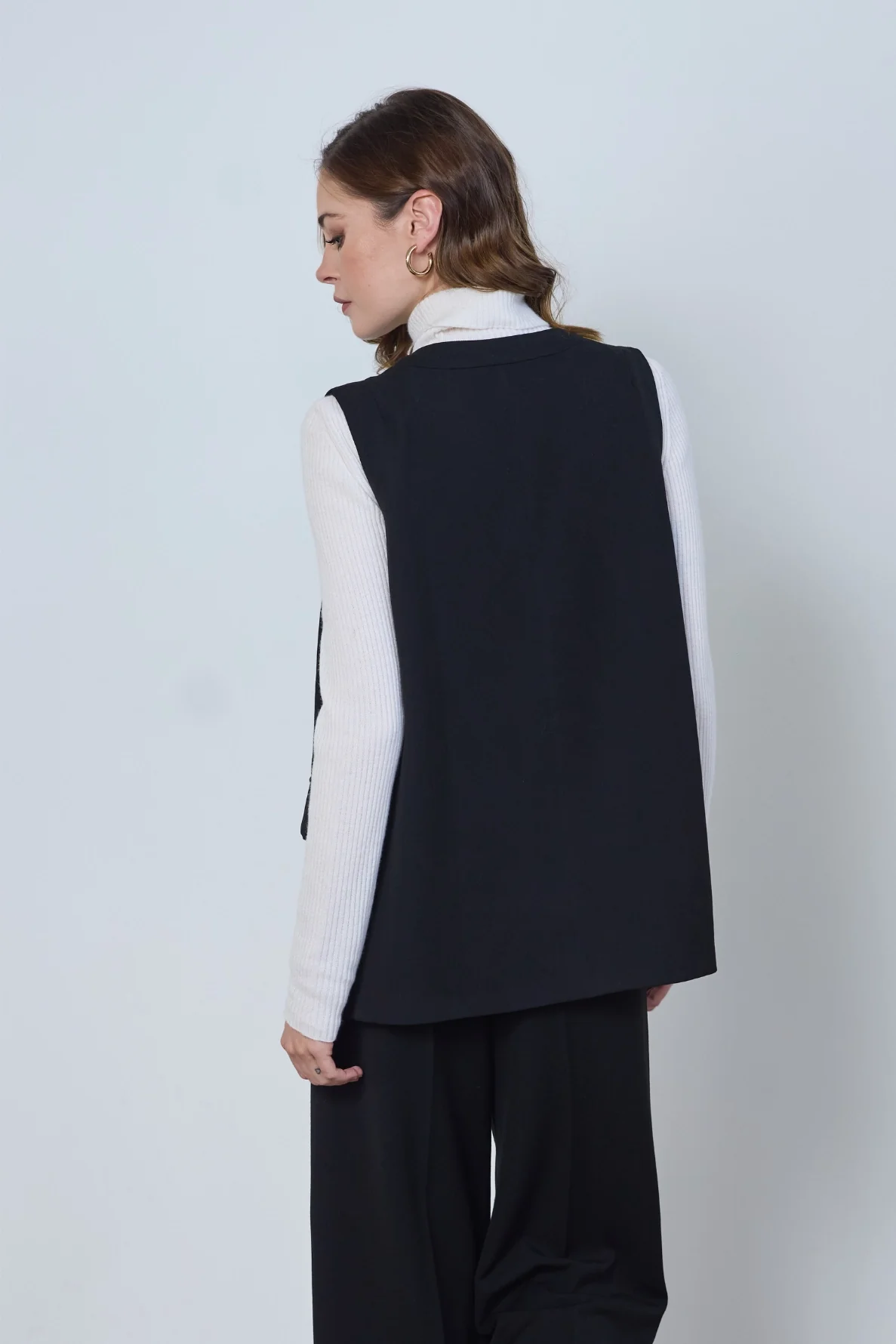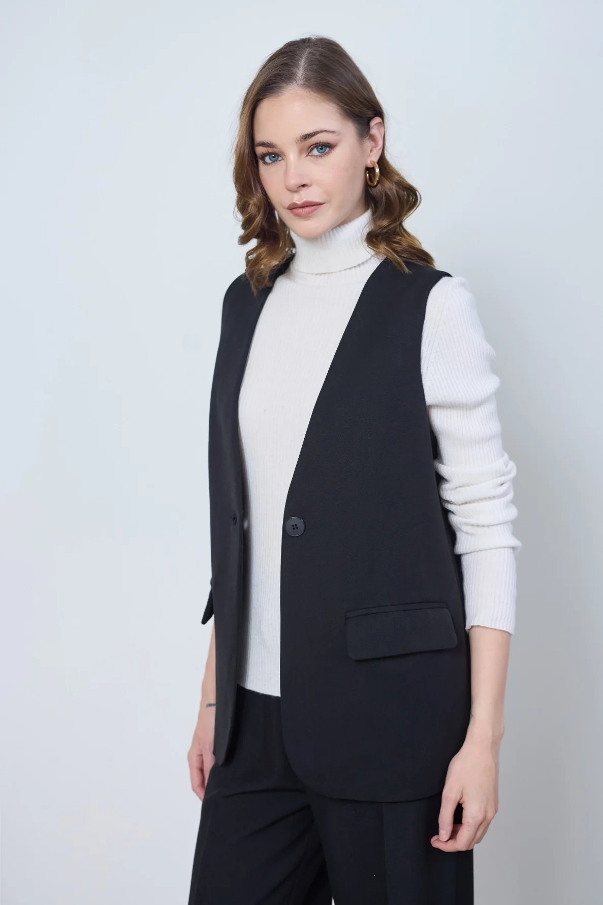 Veste tailleur sans manches Ambre, chic et contemporaine. Sa coupe épurée et son tissu fluide apportent élégance et légèreté à vos looks.