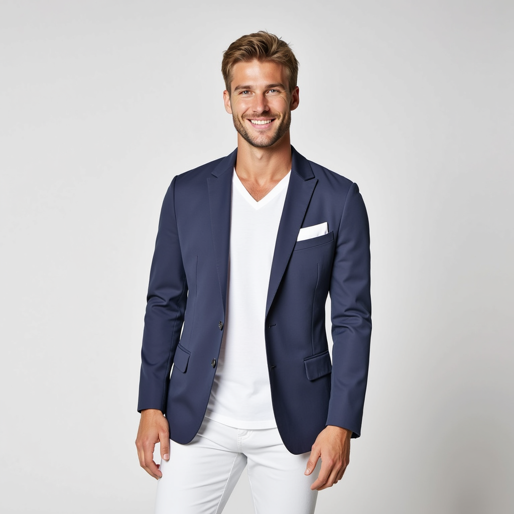 - Les détails raffinés (poches à rabat, boutons discrets, pochette blanche), qui font la différence sans en faire trop.
