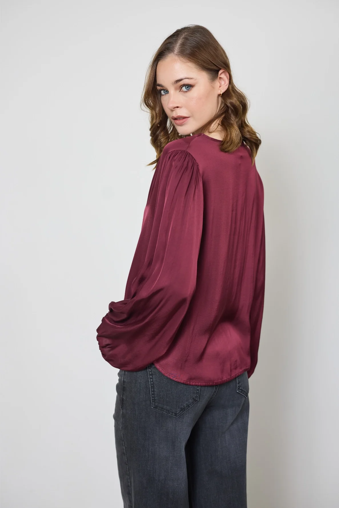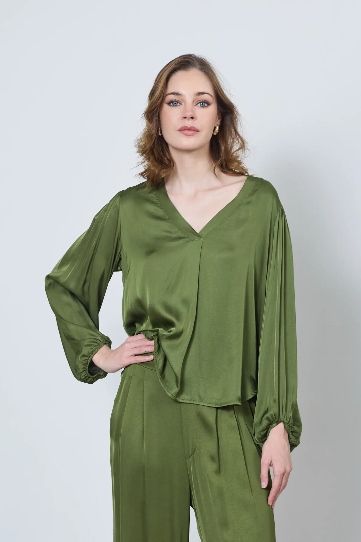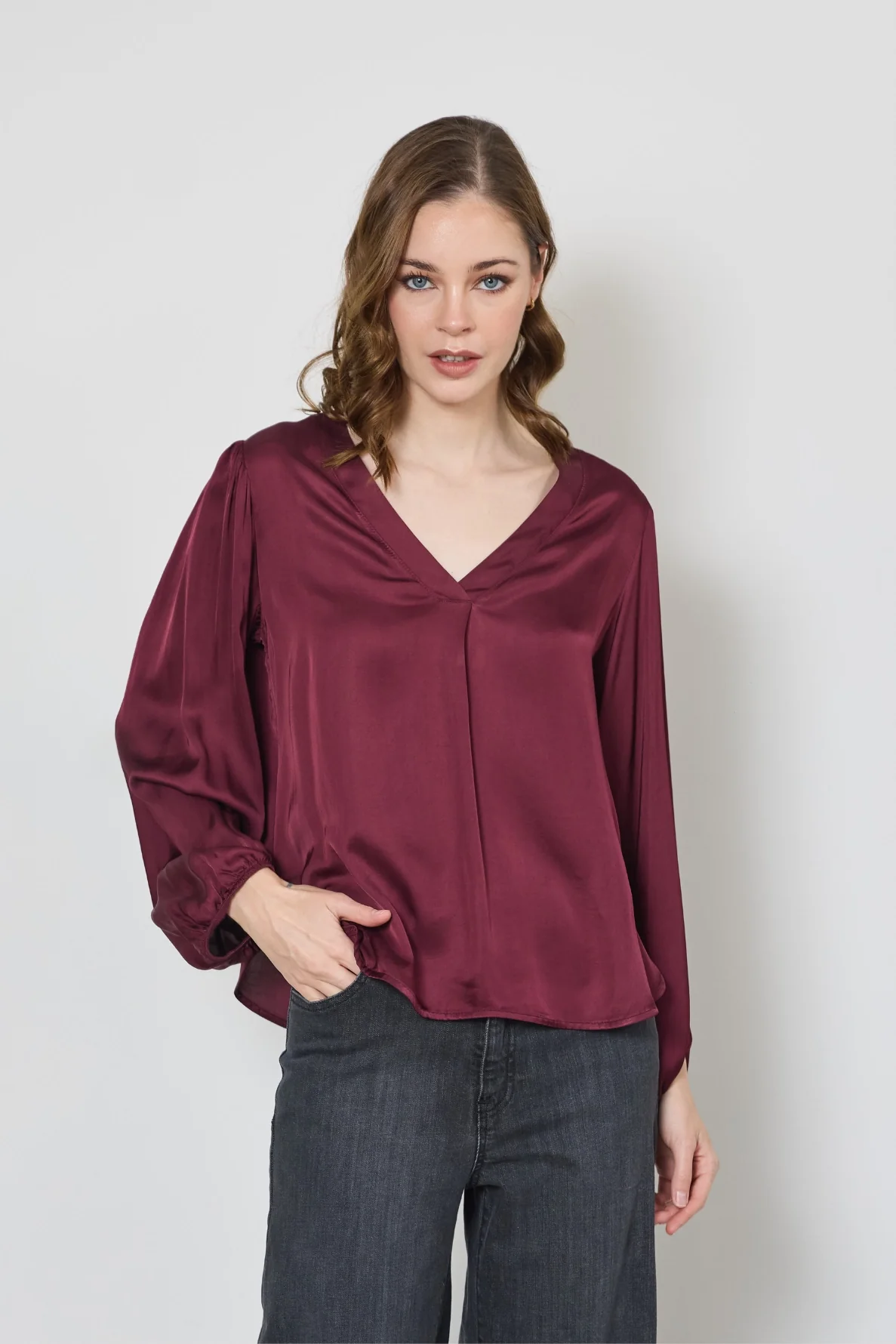 Fluide et élégante, la blouse Cécilia en satin offre douceur et confort. Son col en V et ses poignets élastiqués subliment toutes vos tenues avec raffinement.