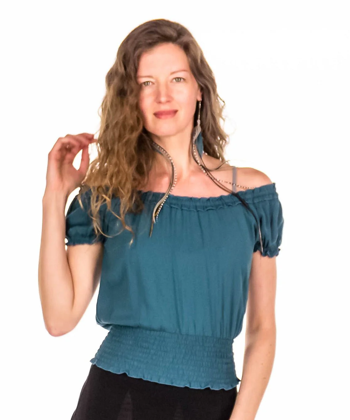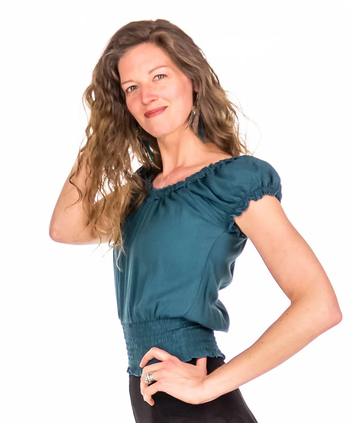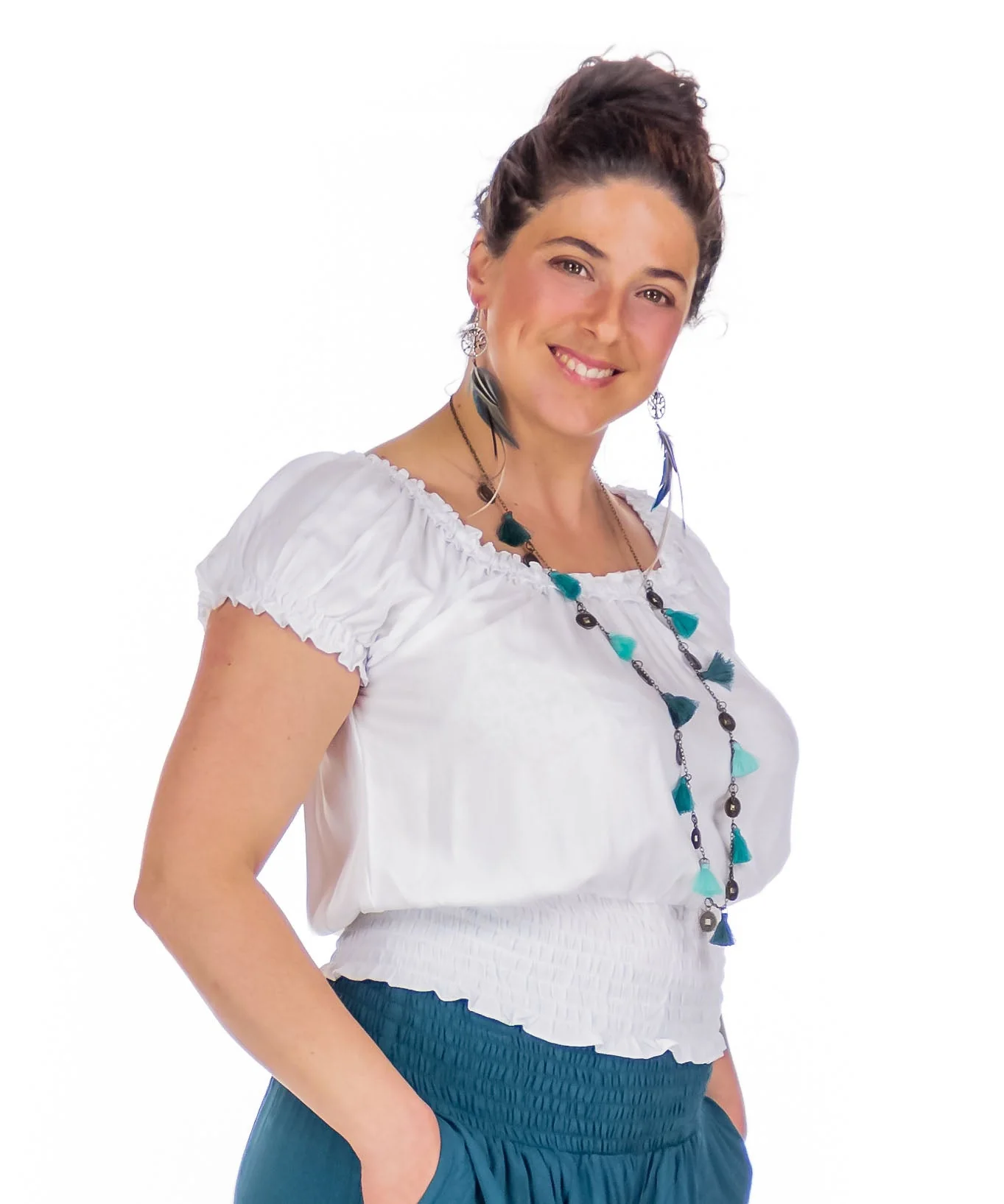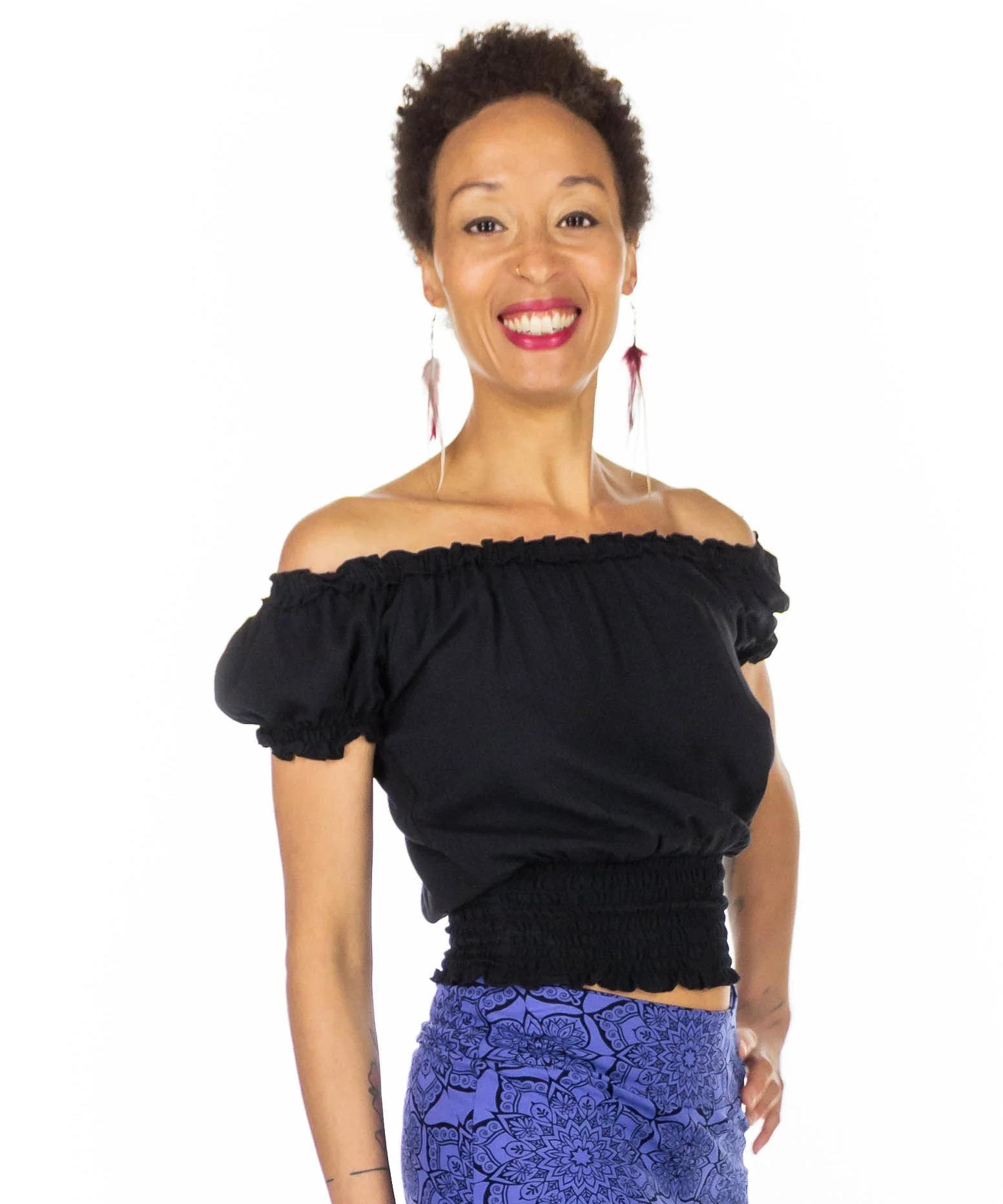 Blouse courte Boho avec taille élastique, Bras et décolleté elastique qui donne une jolie manche bouffante. Style décontracté. 100% rayonne, Fait en Indonesie, laver à la main, étendre pour secher.