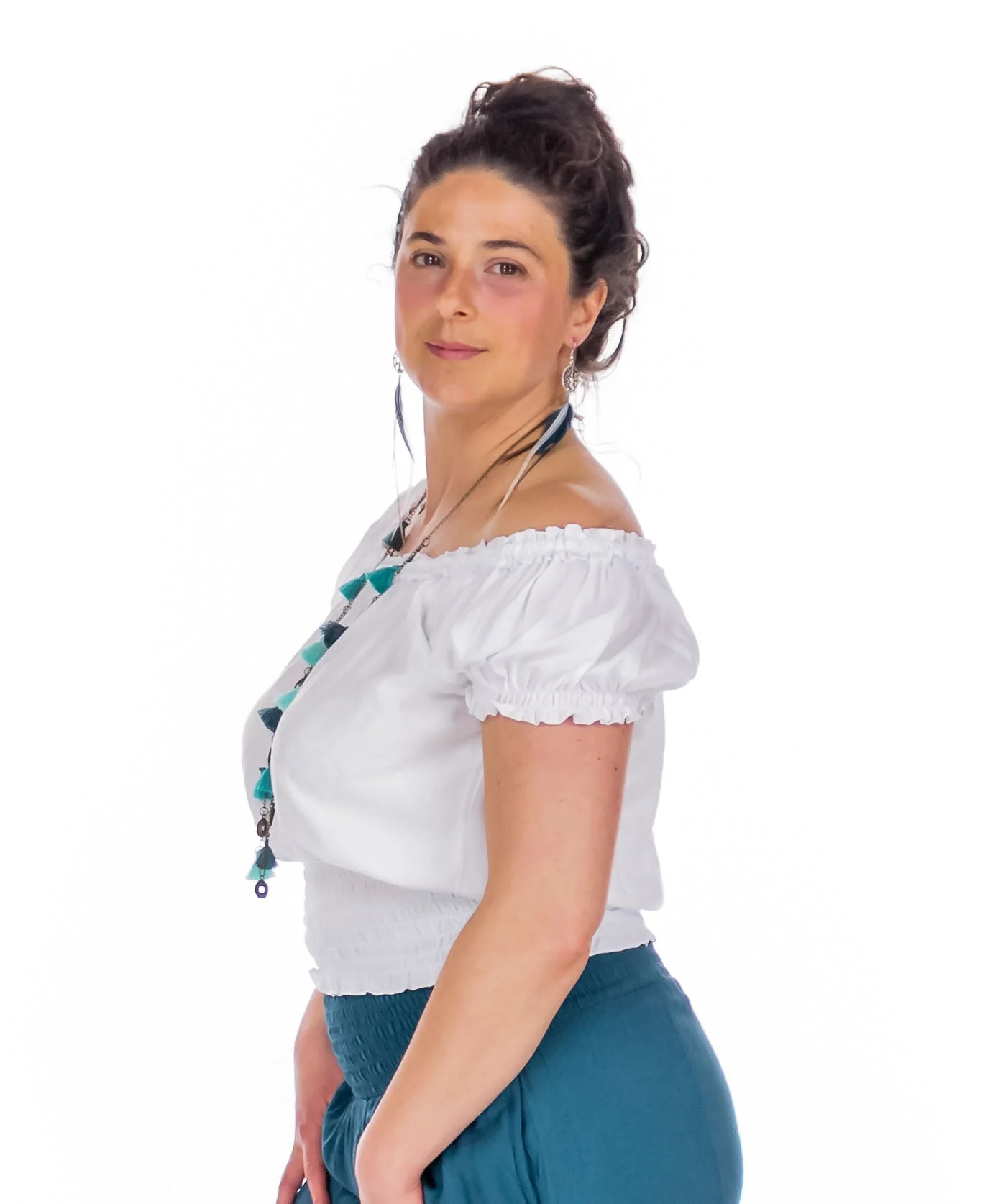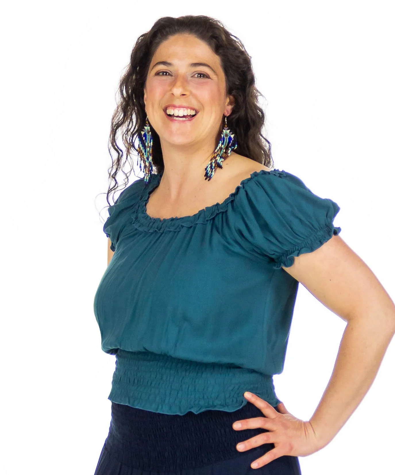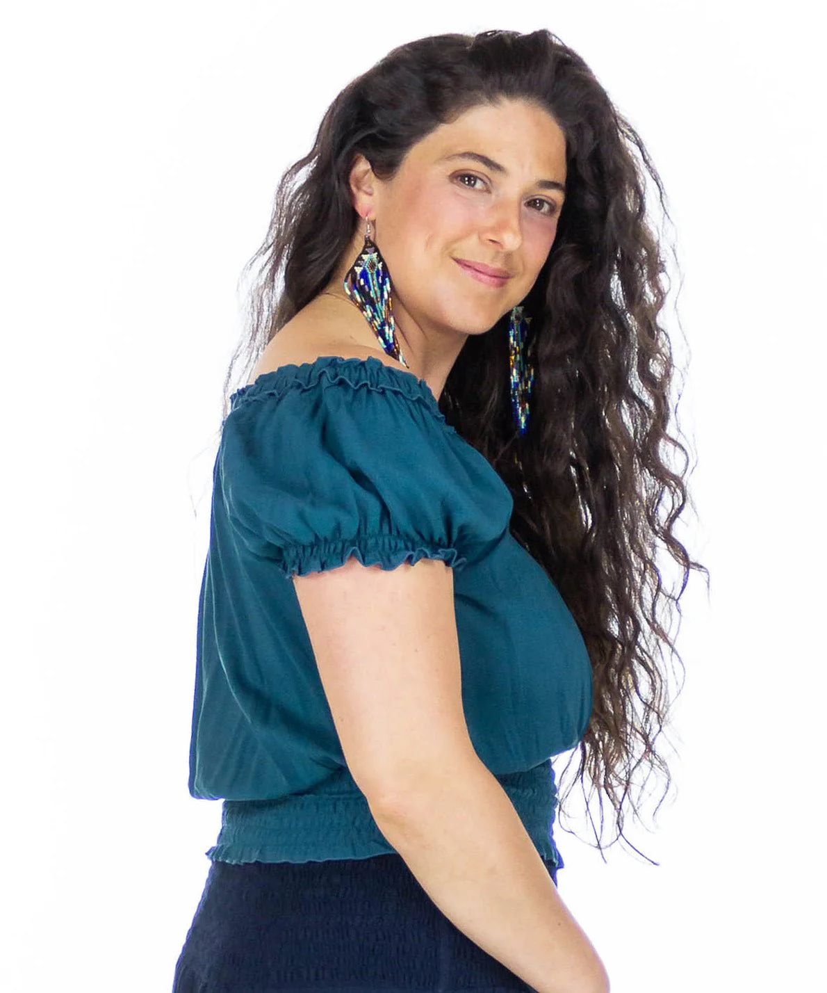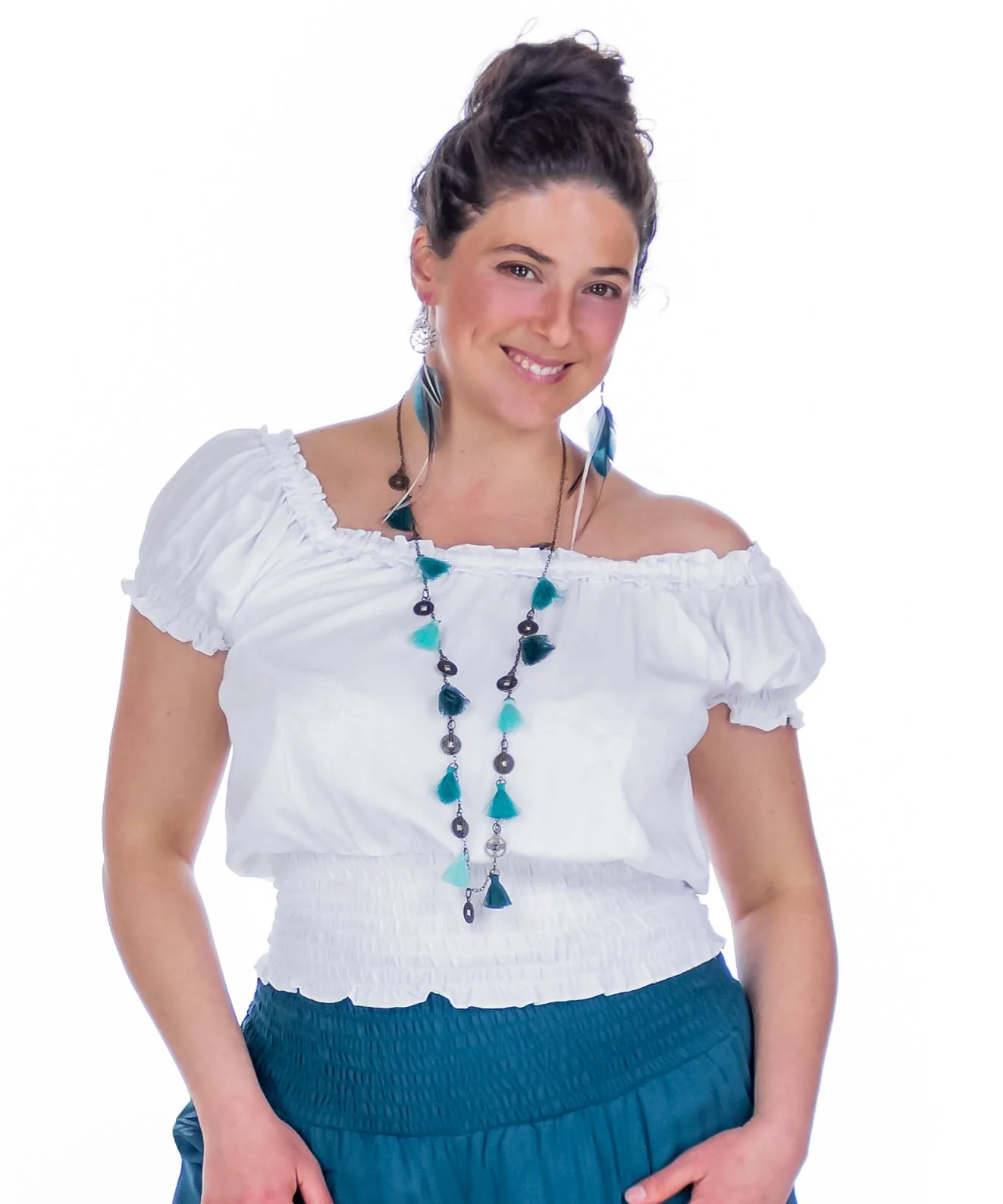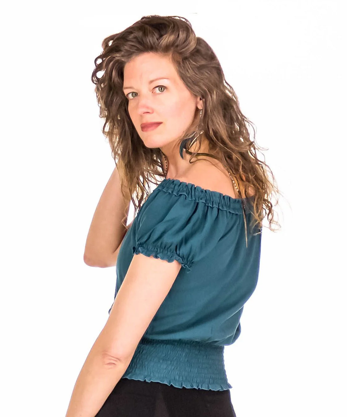 Blouse courte Boho avec taille élastique, Bras et décolleté elastique qui donne une jolie manche bouffante. Style décontracté. 100% rayonne, Fait en Indonesie, laver à la main, étendre pour secher.