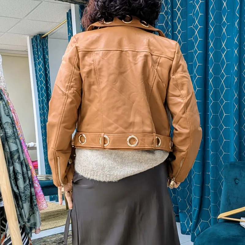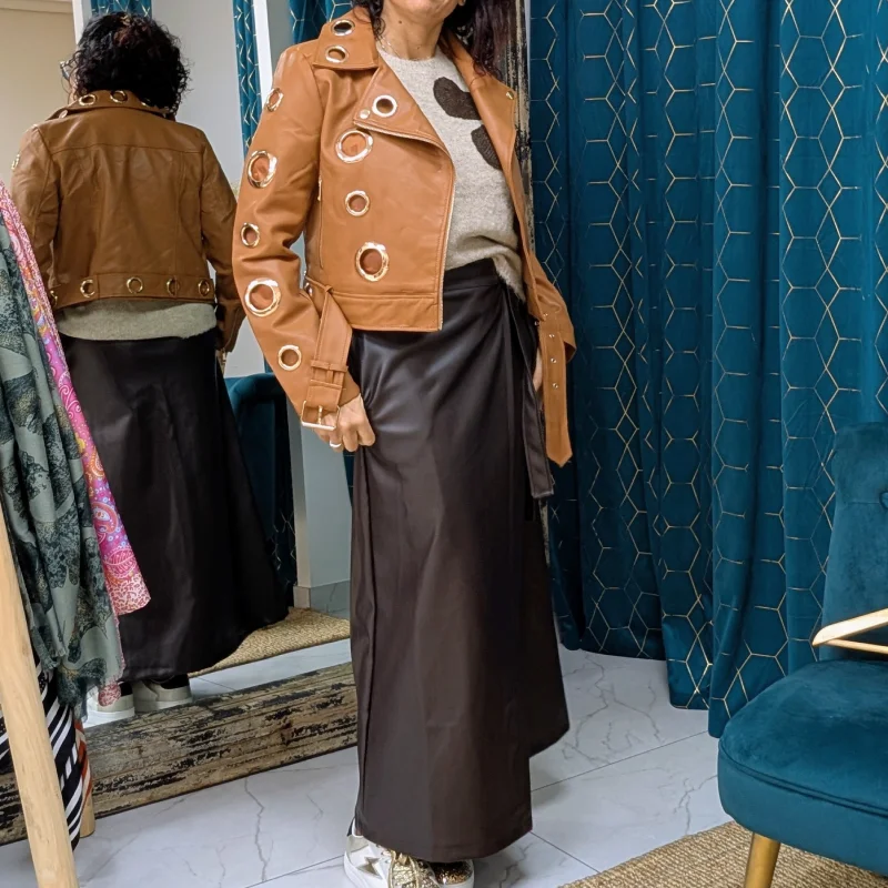 Le blouson court camel avec œillets dorés est extrêmement polyvalent. Il peut être associé à un jean pour un look décontracté ou porté par-dessus une robe pour une allure plus habillée. Sa couleur neutre le rend facile à assortir avec d’autres pièces de votre garde-robe, tout en ajoutant une touche de couleur chaude qui illumine votre tenue.