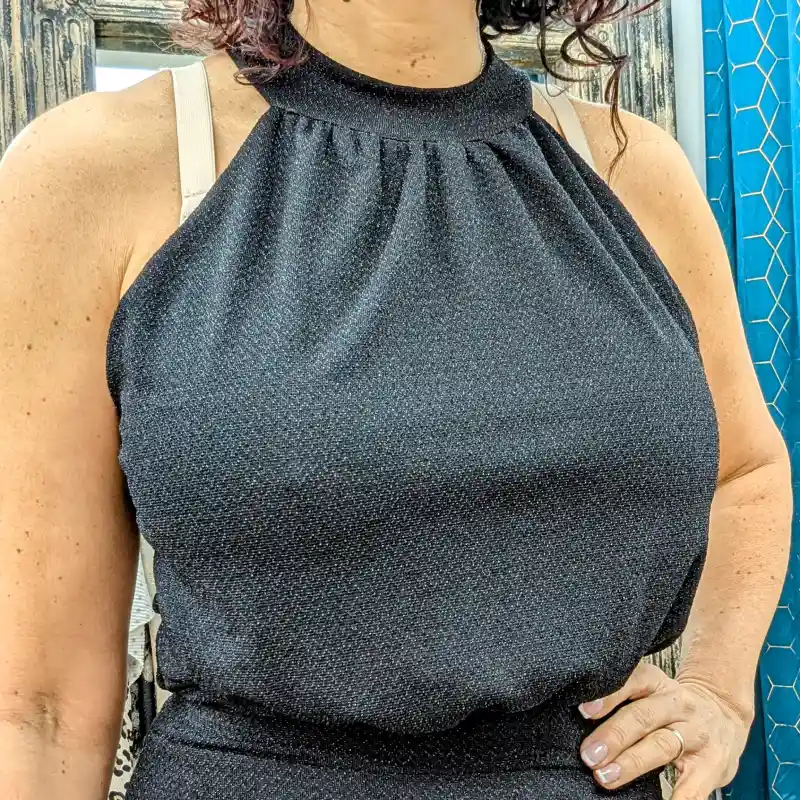 Le body présente un col resserré et montant qui met en valeur le cou tout en ajoutant une note de sophistication. Ce col se ferme par un petit bouton dans la nuque, apportant une finition soignée et délicate. De plus, les épaules sont légèrement découvertes, tant à l’avant qu’à l’arrière, ajoutant une touche de sensualité à votre look.