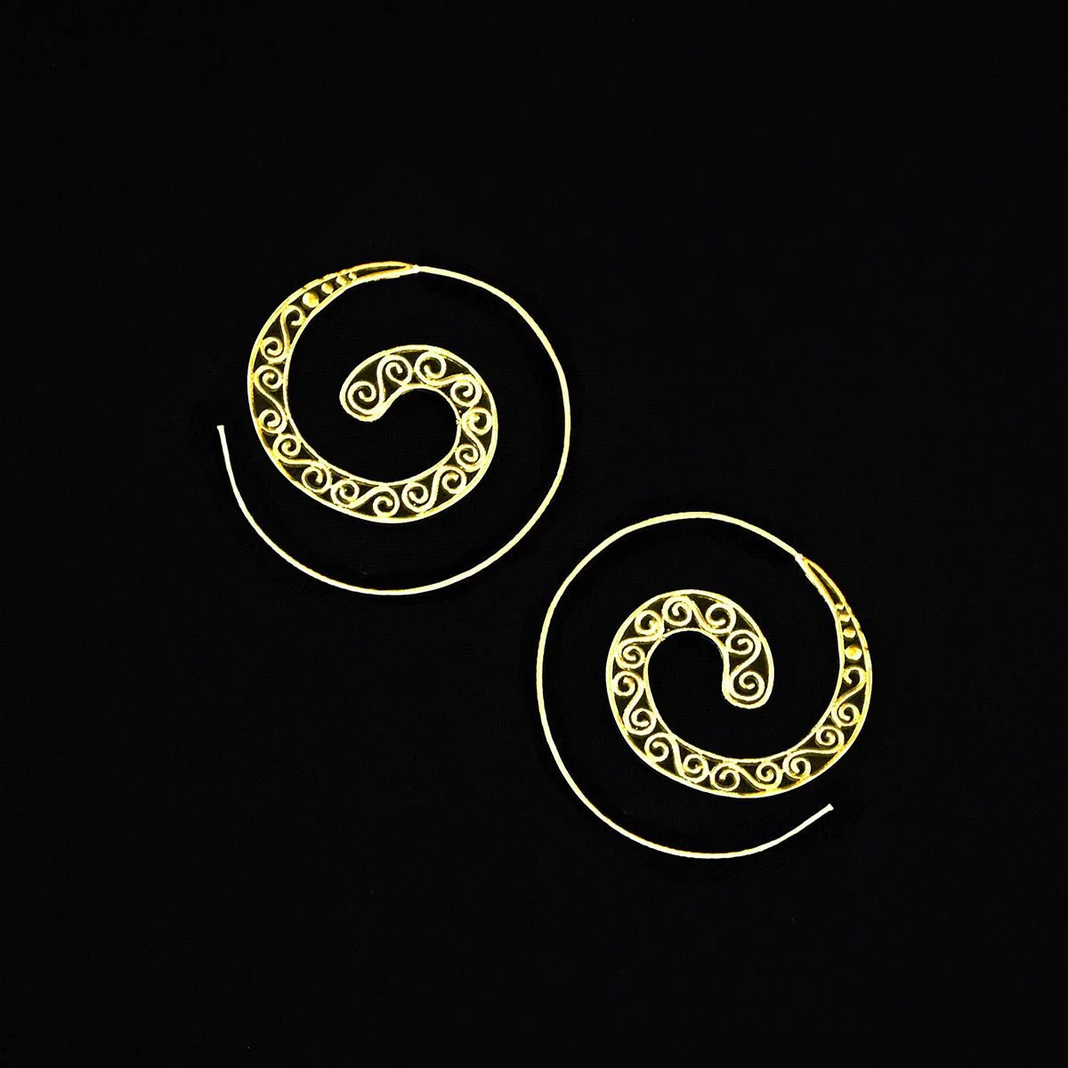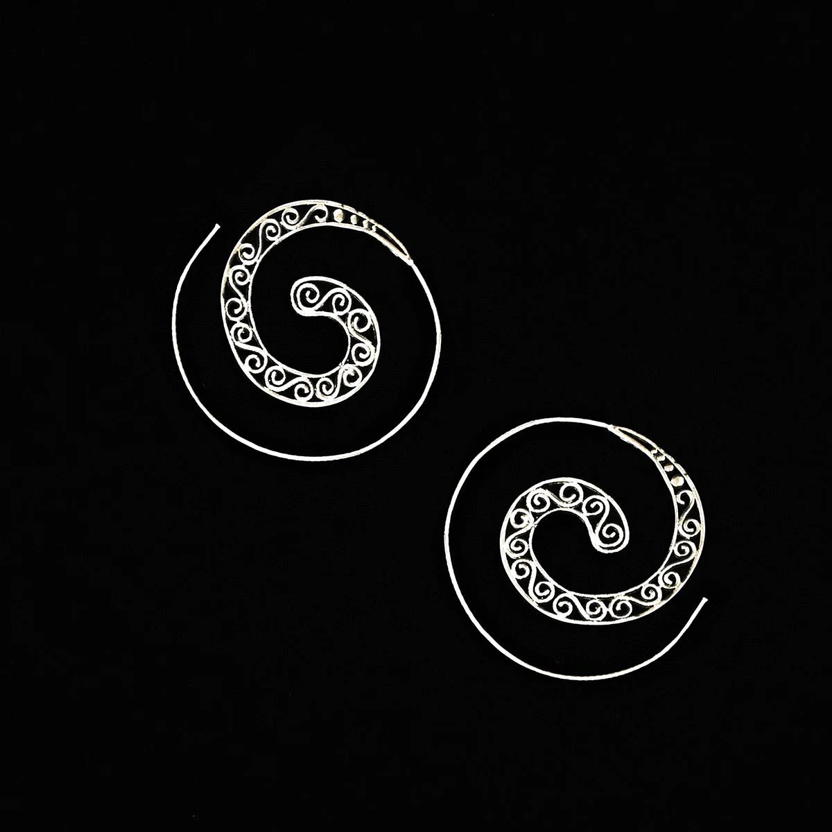 Ces boucles d’oreilles en spirale fabriquées à la main sont entourées d’un superbe motif orné et délicat.
