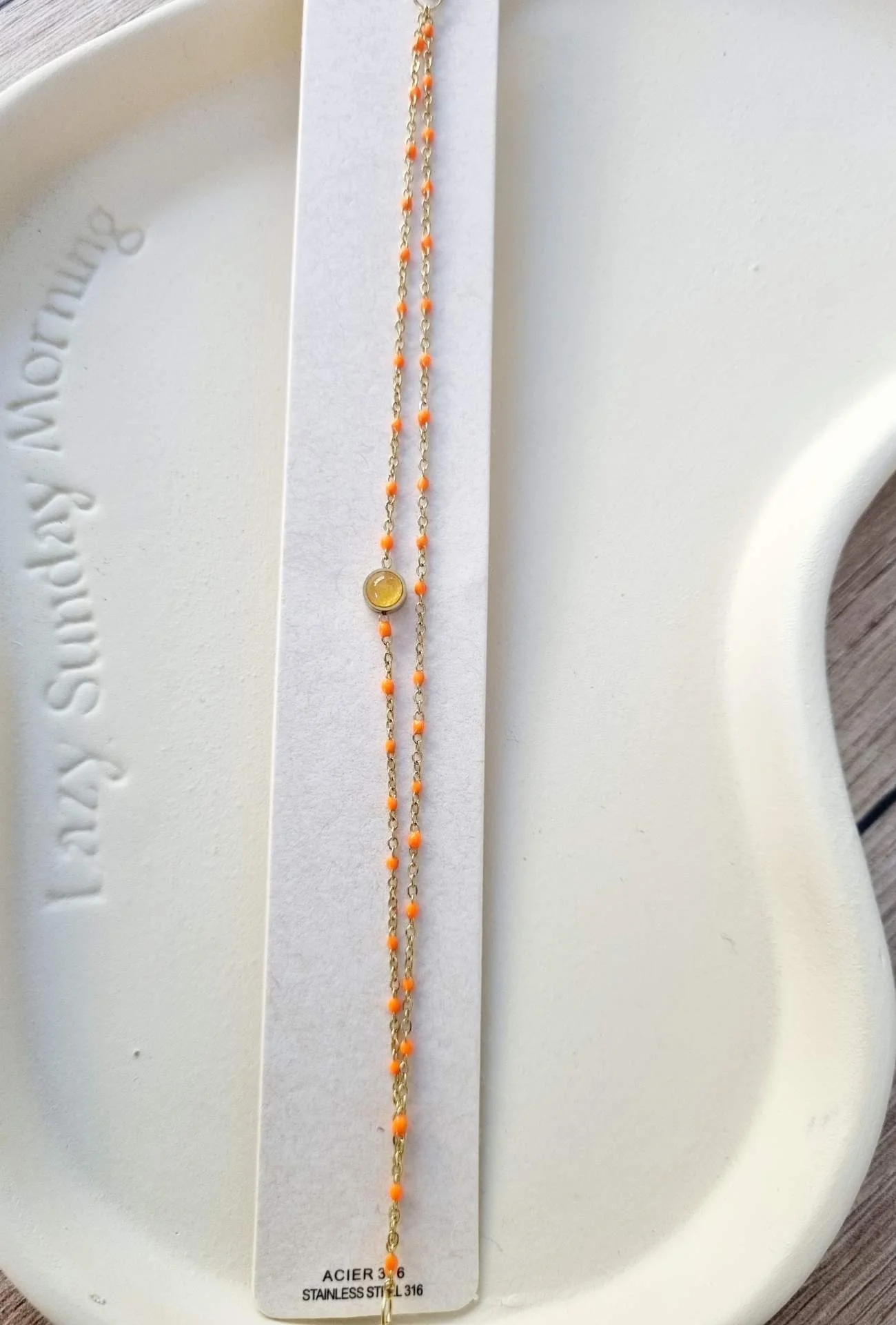 Ajoutez une touche d’élégance et de couleur à votre poignet avec le bracelet CELINE. Ce bijou à double rang, orné de perles d’un orange éclatant, est idéal pour illuminer vos tenues avec modernité. Disponible en plusieurs teintes vibrantes – bleu turquoise, orange, blanc et rose – il s’adapte parfaitement à vos envies et à toutes les occasions. Conçu en acier inoxydable doré, il offre une brillance durable et un confort optimal.
