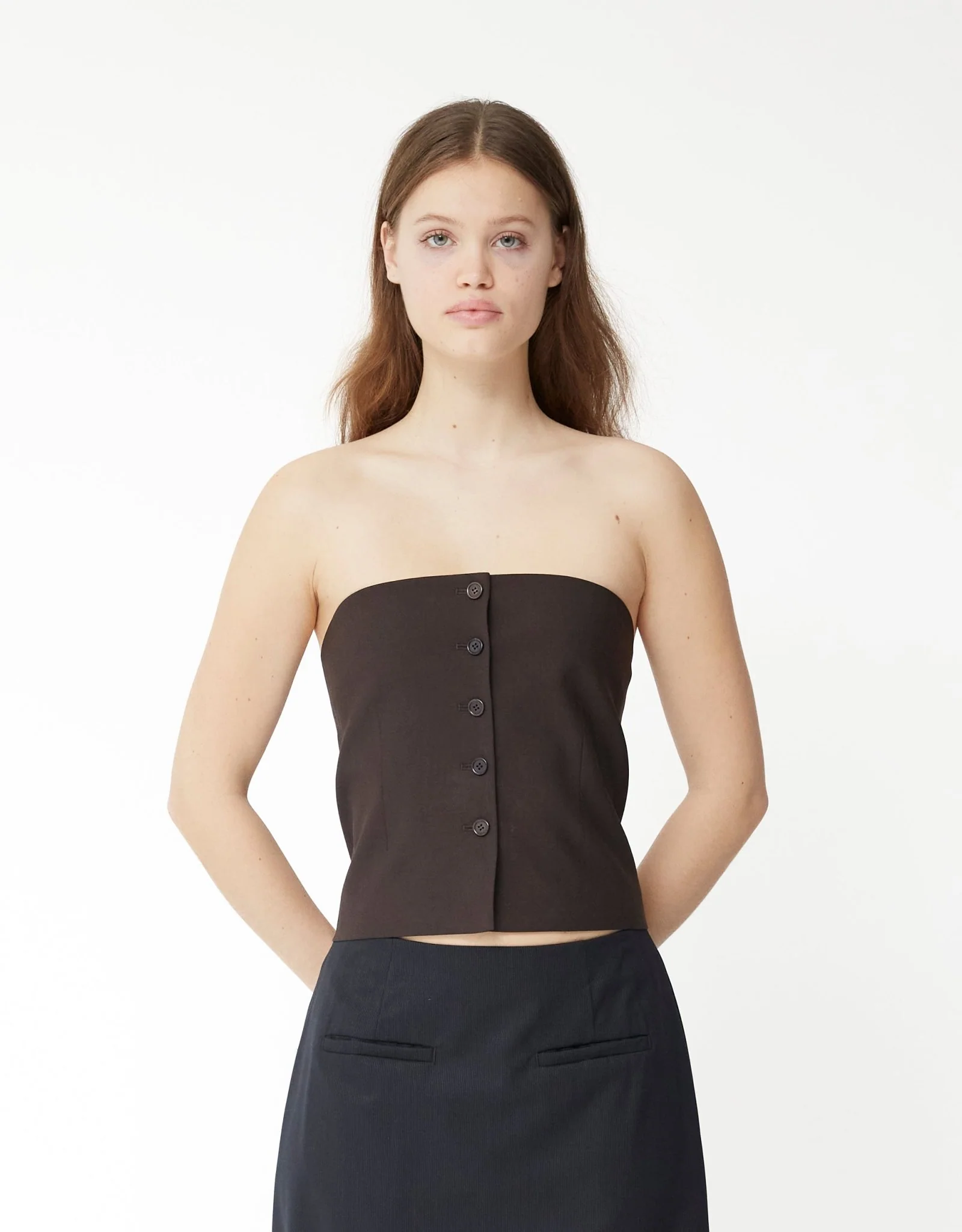 The Amomento Button Up Bustier er et chic supplement til enhver garderobe, fremstillet i en sofistikeret blanding af uld, polyester og zentra. Dette strukturerede stykke har et strømlinet color block-design, der giver et moderne twist til en klassisk silhuet. Polyesterforingen sikrer komfort, mens den knappelukkede front tilfører et strejf af elegance. Perfekt til lag-på-lag eller som et statement-stykke, løfter denne bustier ubesværet ethvert outfit med sit raffinerede æstetiske udtryk og alsidige design.