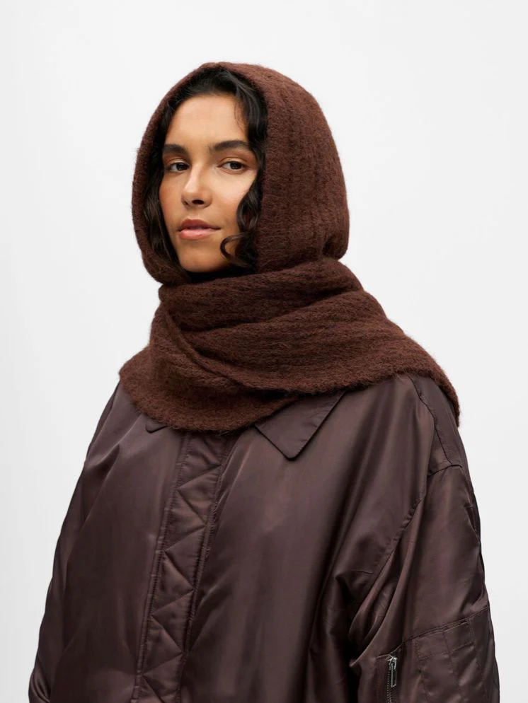 Cagoule-écharpe en maille. Grande capuche. Modèle noué sur le devant. Maille côtelée. Taille unique Matières: 59% Polyester recyclé, 21% Nylon, 11% Polyester, 8% Laine, 1% Élasthanne