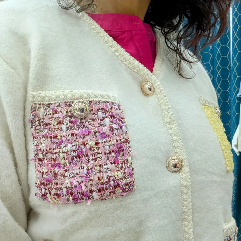 Pour plus de praticité, le gilet est doté de deux petites poches plates au niveau de la poitrine. Ces poches, réalisées dans des matières et coloris différents, sont ornées d’un bouton doré, ajoutant une touche d’originalité. Plus bas, vous trouverez deux poches plates plus grandes, également en couleurs variées, enrichies de filaments dorés qui scintillent subtilement à la lumière. Ces éléments ne sont pas seulement esthétiques, ils offrent également une fonctionnalité indispensable pour garder vos petits objets à portée de main.