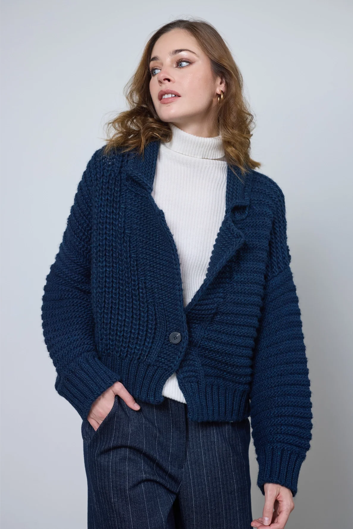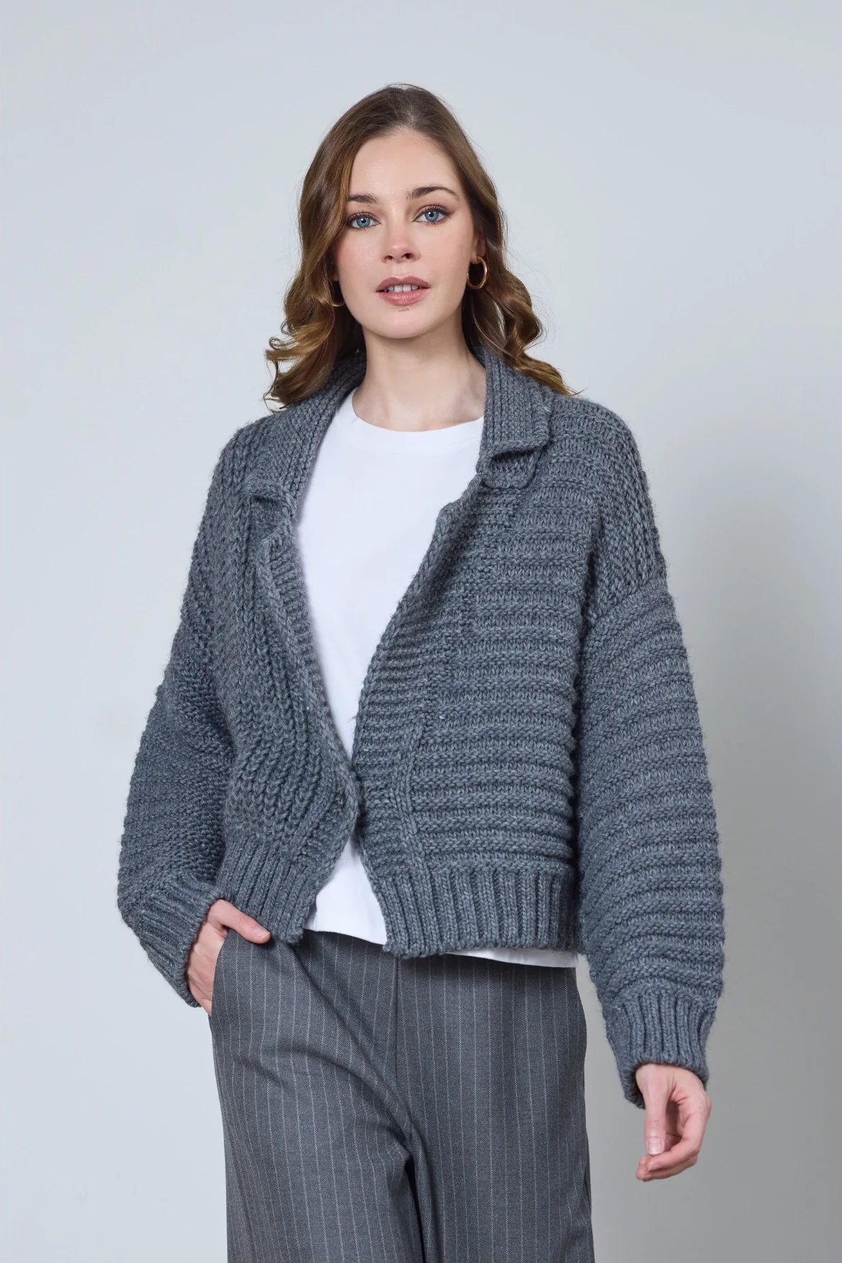 Le cardigan Patricia allie élégance et confort. Sa coupe blazer structurée et son tricotage texturé apportent caractère et style minimaliste à toutes vos tenues.