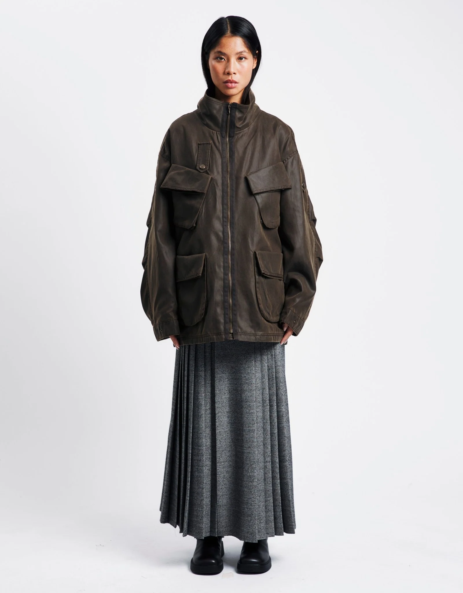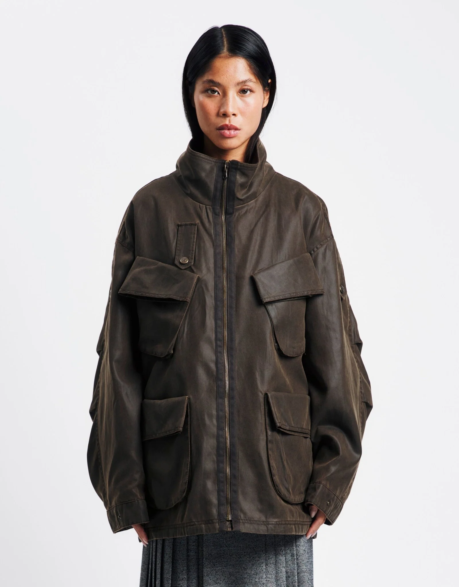 The Cargo Pocket Field Jacket by OPEN YY er et stilfuldt supplement til enhver garderobe. Fremstillet i blank polyester, viser den et oversized fit, der udstråler moderne flair. Denne jakke er gennemtænkt designet med en høj krave og lynlås, som kombinerer form og funktion. Store frontlommer tilføjer et touch af utility, mens justerbare trykknapper ved ærmerne sikrer en personlig pasform. Perfekt til dem, der værdsætter dristige modetilføjelser uden at gå på kompromis med funktionaliteten.