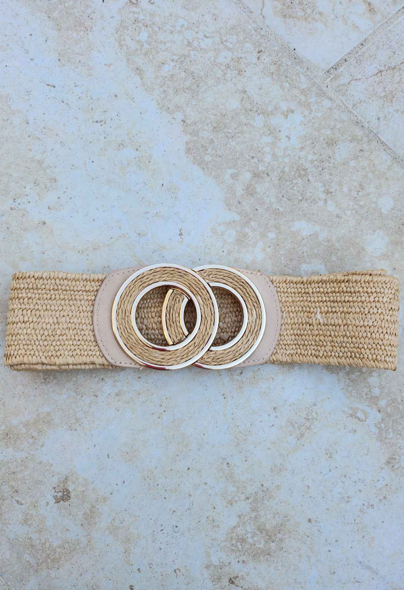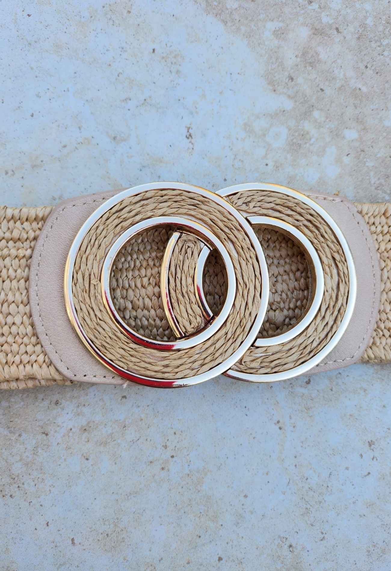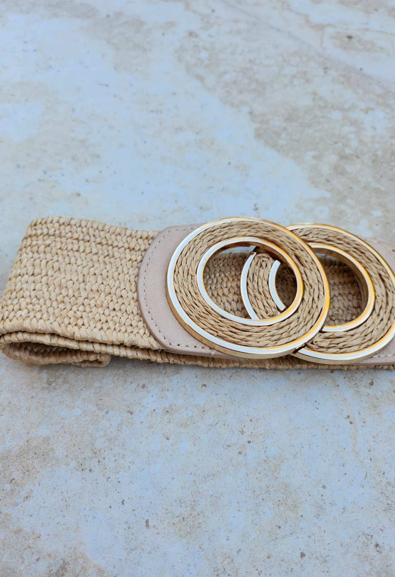 Ajoutez une touche bohème et élégante à vos tenues avec la ceinture ondo beige. Confectionnée dans une matière tressée légère, elle est rehaussée par deux boucles dorées entrelacées qui apportent une note chic à l’ensemble. Parfaite pour marquer la taille, cette ceinture s’adapte à toutes vos envies de style.