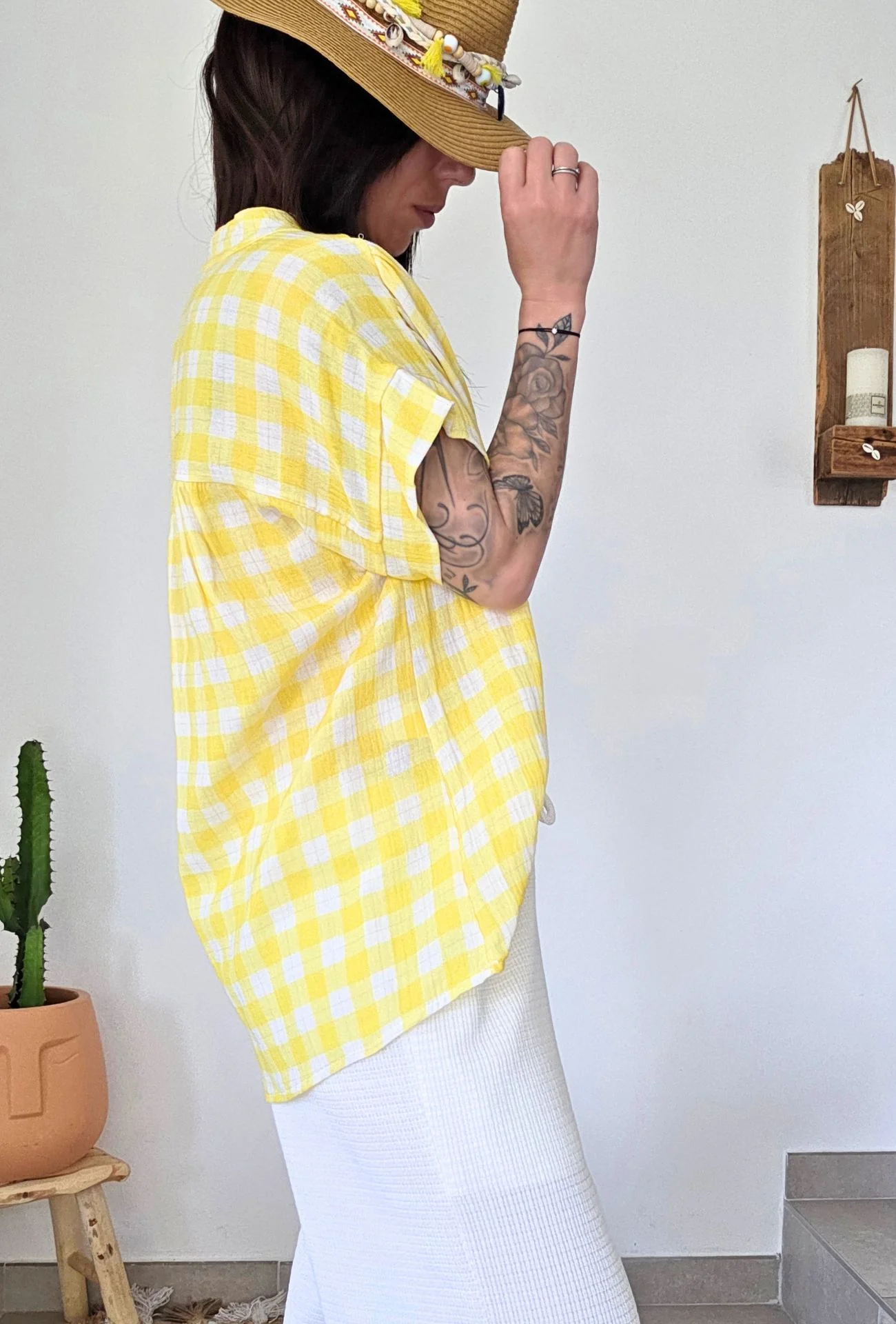 Apportez une touche de pep’s à votre dressing avec le chemisier CARO en version jaune lumineux. Ce modèle à carreaux vichy revisite les classiques avec fraîcheur et légèreté. Sa coupe ample et fluide, combinée à son col tunisien et ses manches courtes tombantes, en fait une pièce ultra agréable à porter tout au long de la saison. Son tissu léger 100% coton vous offre confort et respirabilité, parfait pour les journées ensoleillées. Avec son esprit champêtre chic et son motif rétro remis au goût du jour, il s’adapte à tous les styles et toutes les envies.