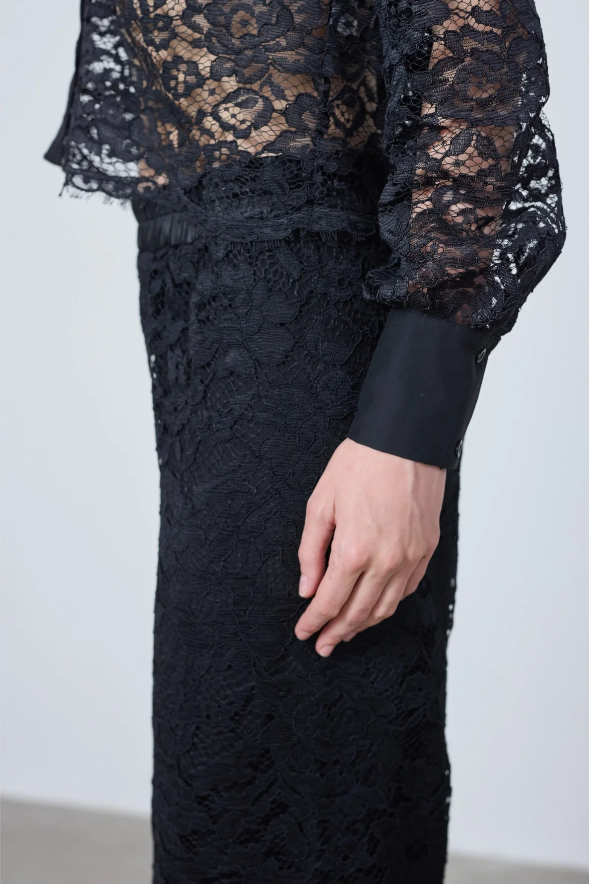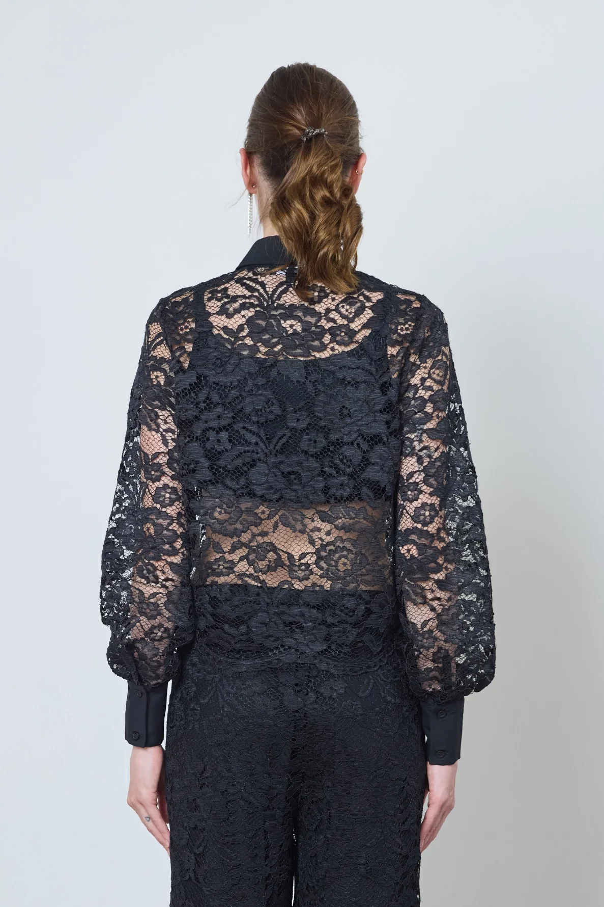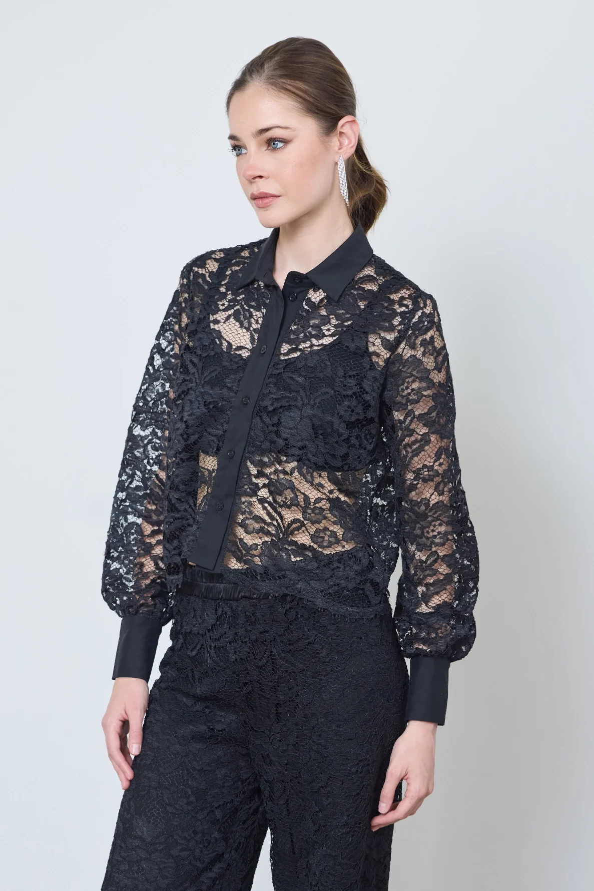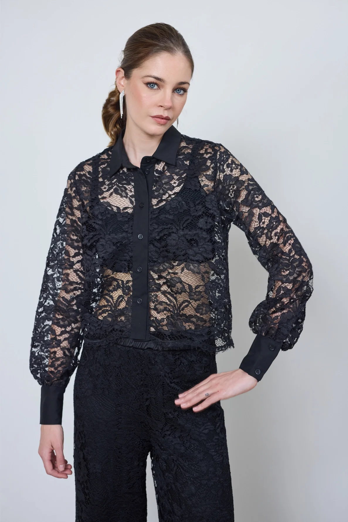 Chemise Flore en dentelle noire délicate, légère et raffinée. Transparence subtile pour un look élégant, de jour comme de nuit.