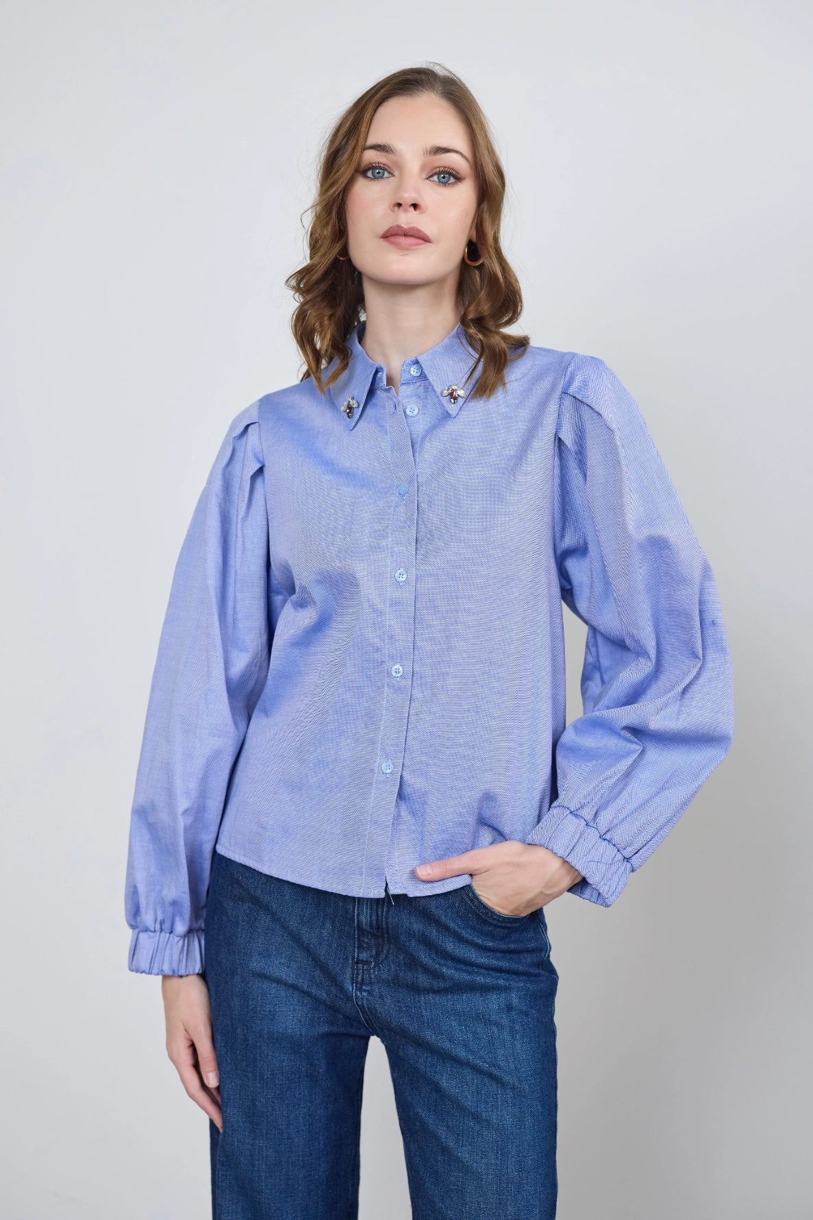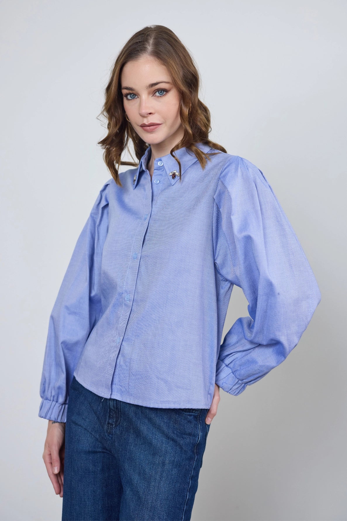 Chemise Henriette en coton Oxford, lumineuse et raffinée. Manches bouffantes et strass au col pour un style féminin, chic et original.