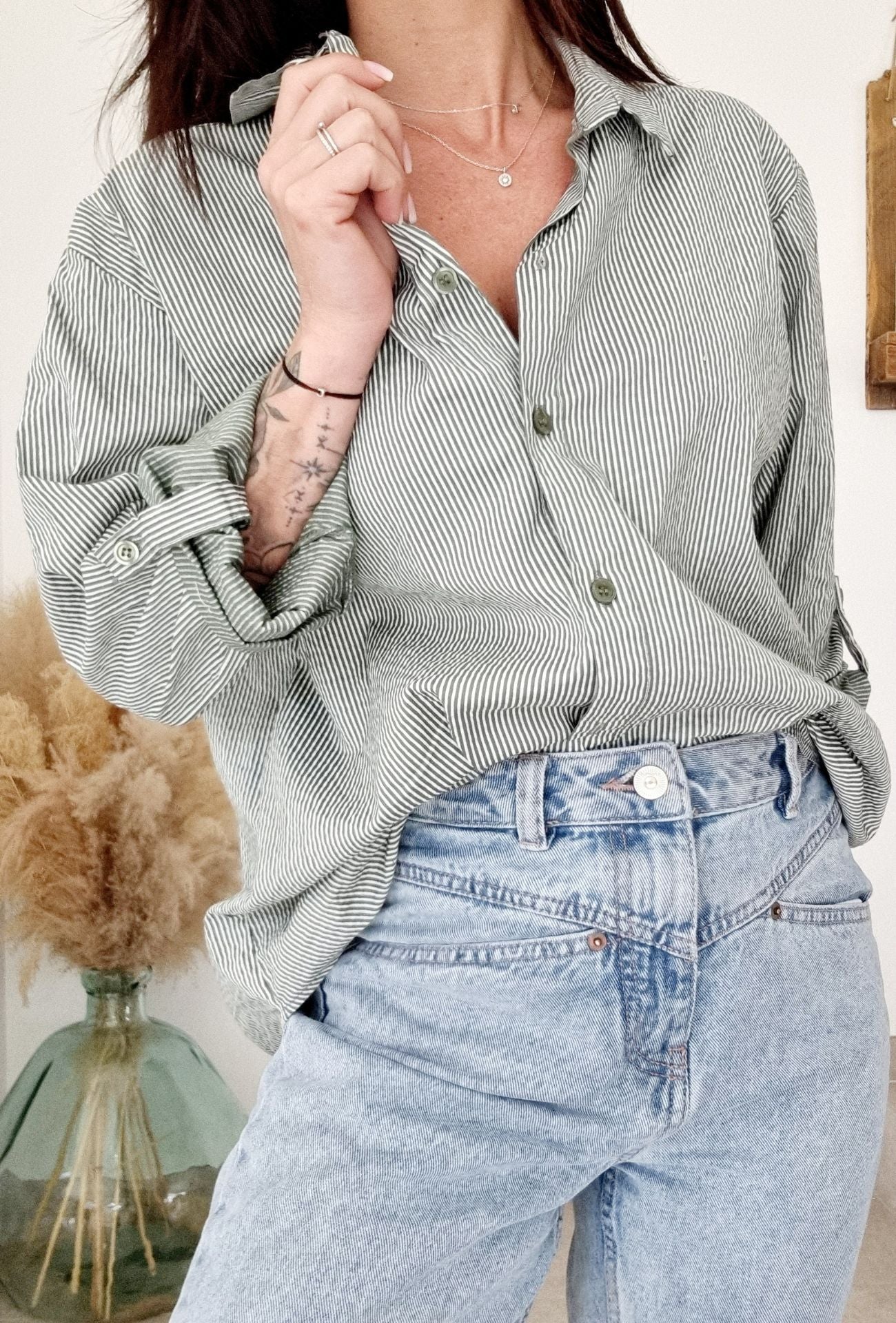 Adoptez un look casual chic avec la chemise SOSO à rayures kaki ! Son tissu léger et fluide offre un confort absolu tout en sublimant votre silhouette. Avec sa coupe oversize, ses manches longues retroussables et son col classique, elle se porte aussi bien fermée qu’ouverte pour un style plus décontracté. Un indispensable du dressing !