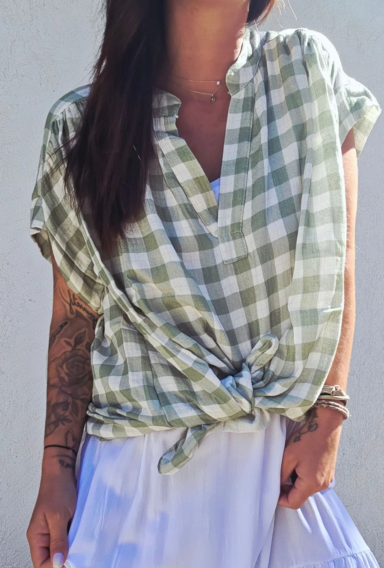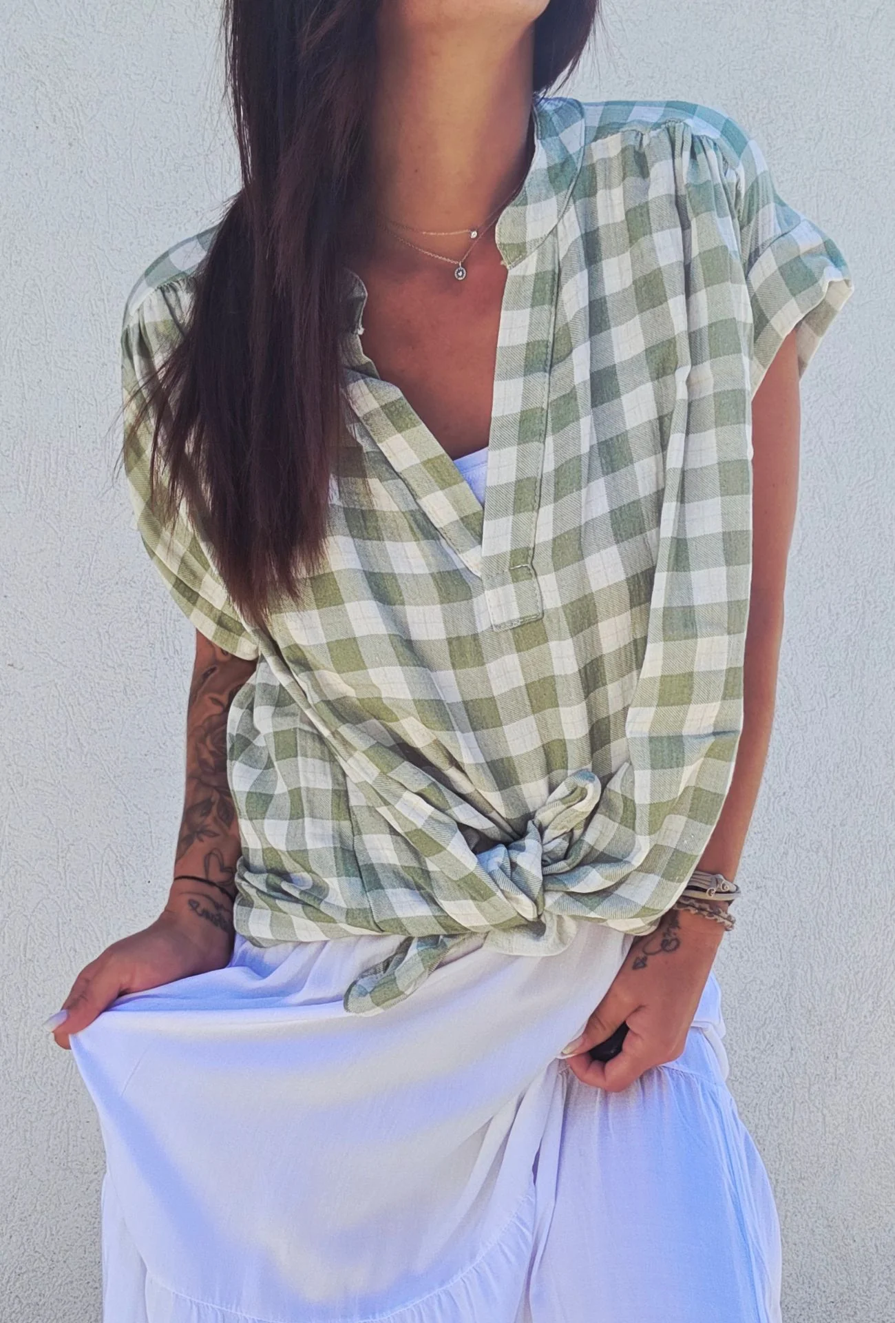 Le chemisier CARO est la pièce fraîche et intemporelle qui s’invite dans votre dressing avec style. Son imprimé vichy kaki ultra tendance réinvente les codes rétro pour une allure moderne et décontractée. Avec sa coupe fluide, ses manches courtes tombantes et son col tunisien légèrement ouvert, il allie confort et féminité à la perfection. Léger, agréable à porter et facile à associer, ce haut s’adapte à toutes les situations, du bureau à la terrasse ensoleillée. Sa palette douce et naturelle s’inscrit dans les tendances actuelles pour une silhouette à la fois chic et casual.