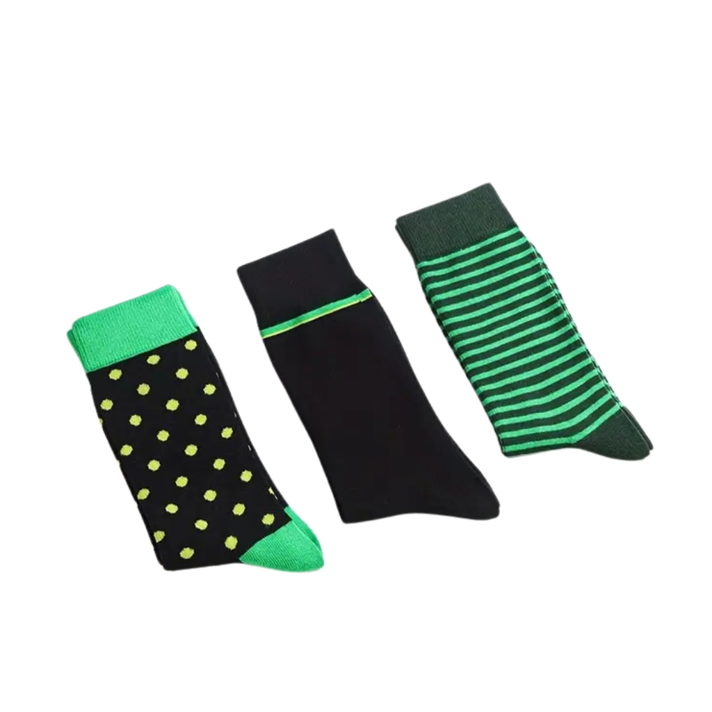 Un lot de 5 paires pensé pour celles et ceux qui aiment les détails qui font la différence. Entre pois, rayures et carrés, dans des tons noirs et verts, ces chaussettes apportent une touche audacieuse mais élégante, facile à intégrer à vos tenues du quotidien.
