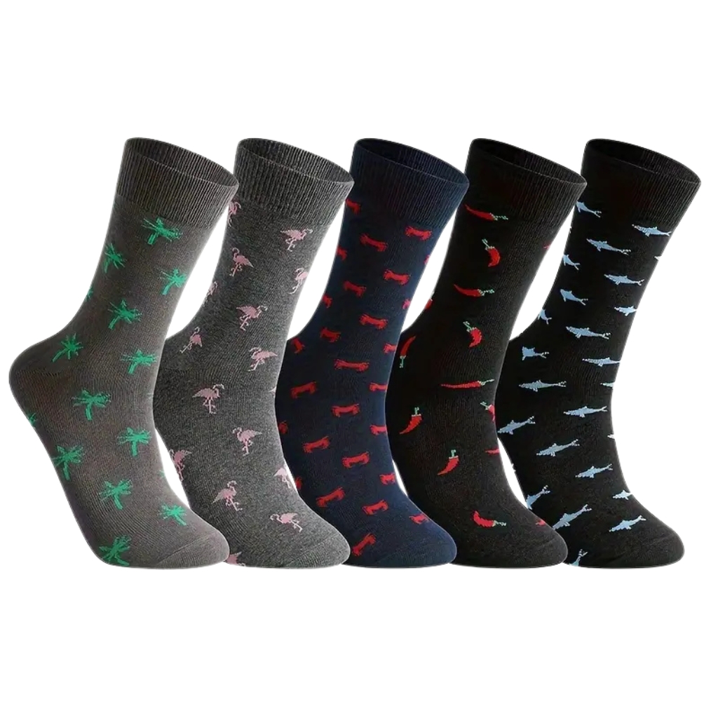 Envie d’un détail qui change tout ? Ce lot de chaussettes mise sur des motifs fun et créatifs pour donner du caractère à vos tenues. Palmiers, flamants roses, chiens, piments et requins apportent une touche ludique, sans compromettre le style ni l’élégance.