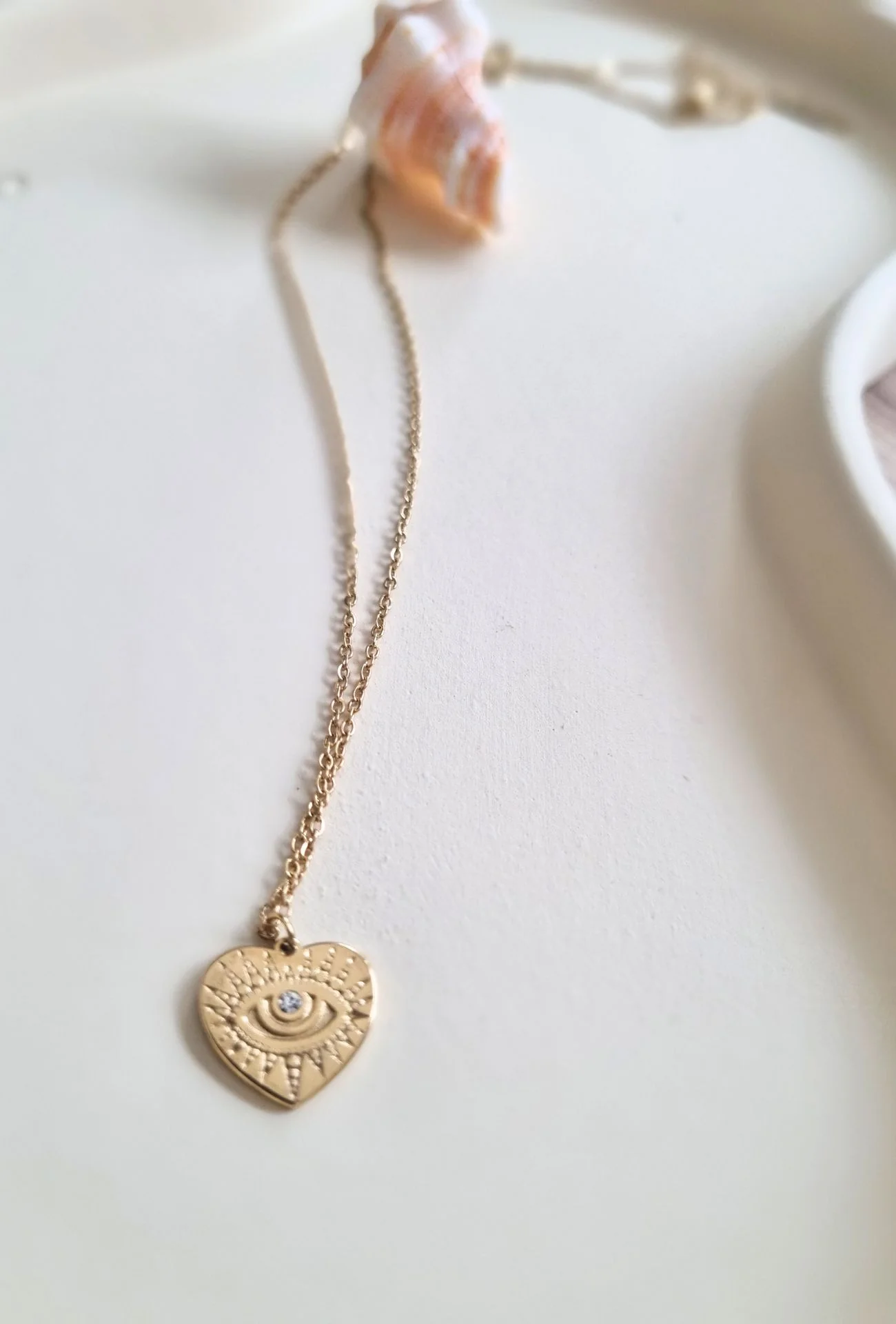 - Pendentif en forme de cœur gravé avec un œil protecteur et un cristal brillant