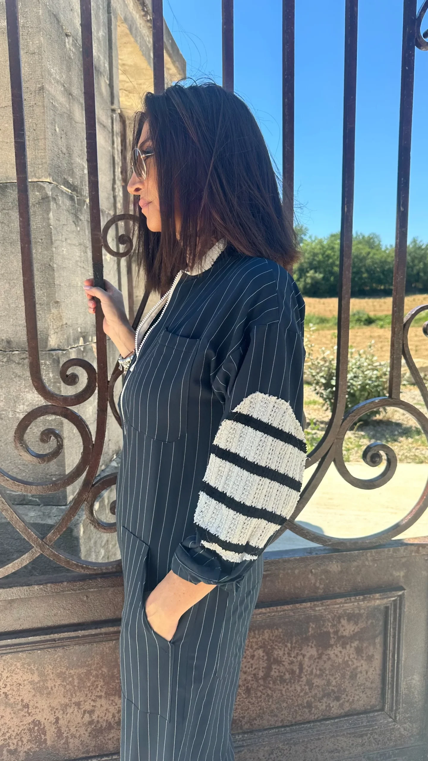 Des fines rayures élégantes, un col stylisé, un renfort au niveau des coudes… et cette fermeture zippée argentée qui tranche parfaitement avec le bleu marine intense.
