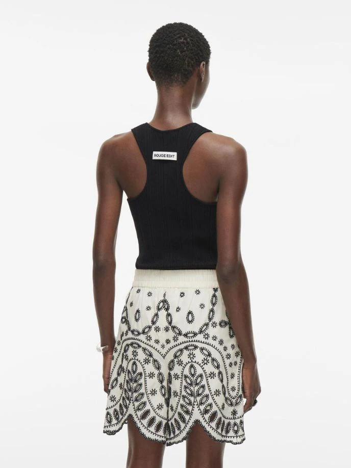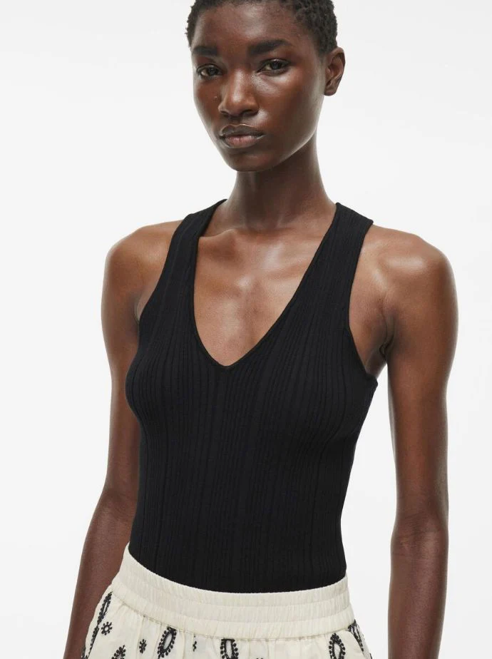 Débardeur en maille. Col en V. Qualité côtelée. Maille douce et extensible. Coupe ajustée.