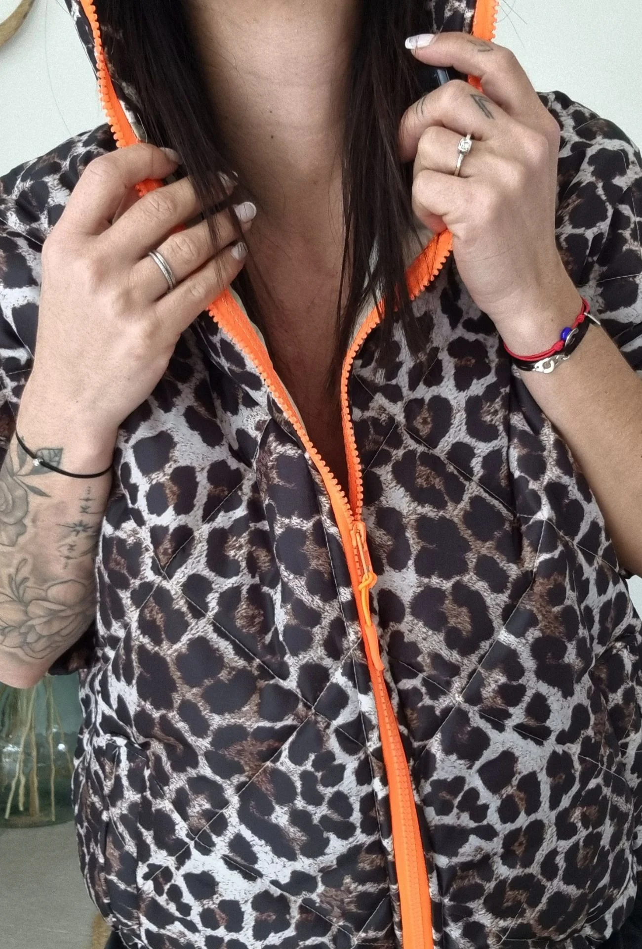 Affirmez votre style avec la doudoune JOHN en imprimé léopard audacieux et sa fermeture éclair orange vibrante. Cette pièce oversize et matelassée allie confort et originalité pour sublimer vos tenues décontractées tout en vous tenant bien au chaud. Son col montant et ses manches courtes ajoutent une touche tendance qui ne passe pas inaperçue.