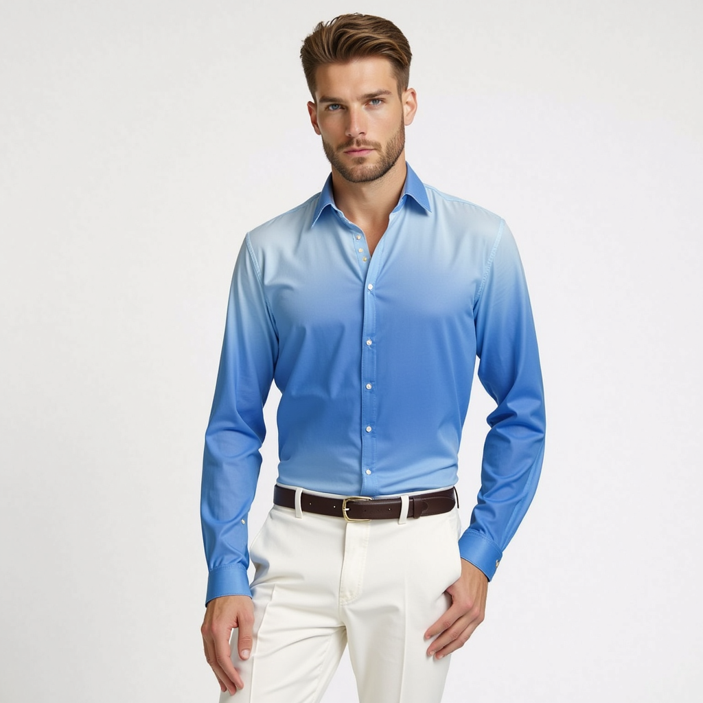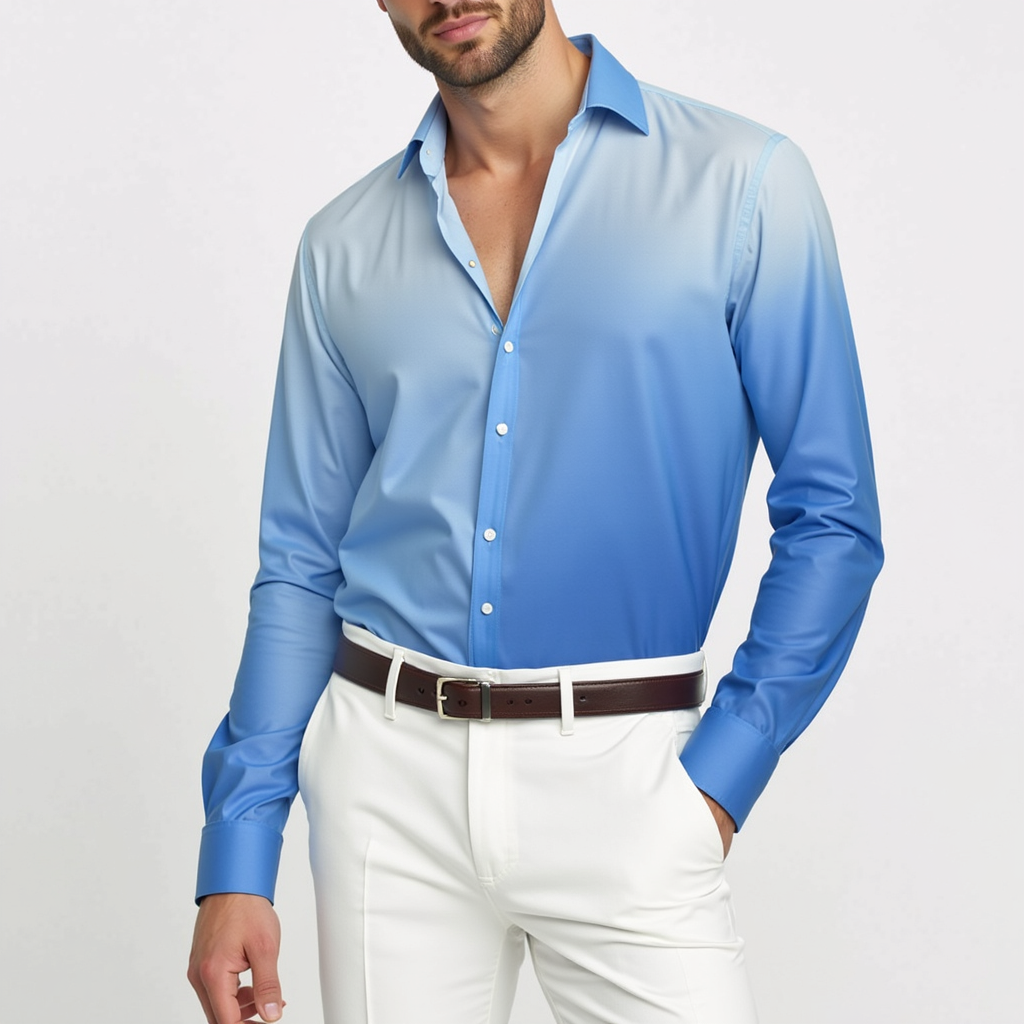 La chemise Élégance Azurée se démarque par son dégradé subtil allant du bleu clair au bleu profond. Un design moderne et sophistiqué qui attire le regard tout en restant élégant. C’est la pièce idéale pour affirmer votre style avec originalité, sans en faire trop.