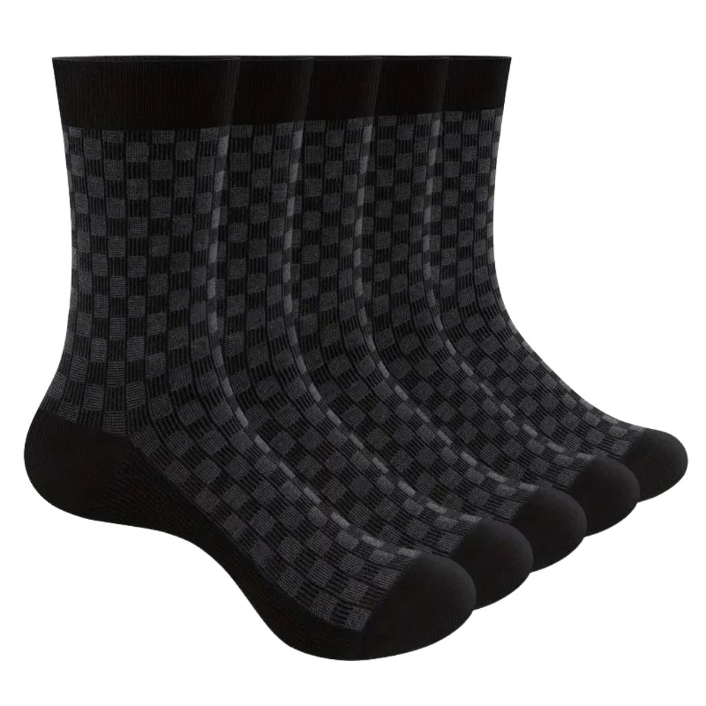 Un lot de 5 paires au style sobre et sophistiqué, parfait pour ceux qui aiment l’élégance sans effort. Le motif à damier discret, associé aux tons noir et gris foncé, apporte une finition raffinée à vos tenues, aussi bien pour le quotidien que pour les occasions plus formelles.