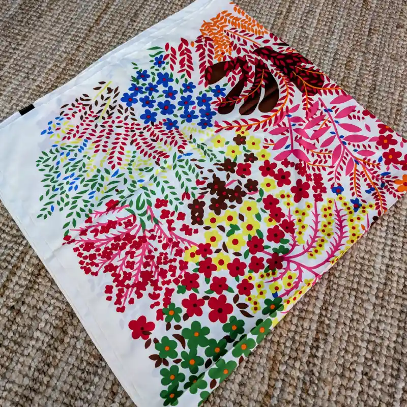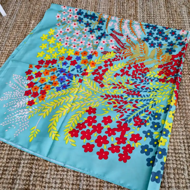 - Turquoise : Ce foulard turquoise évoque des sensations de vacances et de légèreté. Les fleurs colorées sur ce fond lumineux apportent joie et dynamisme à votre style.