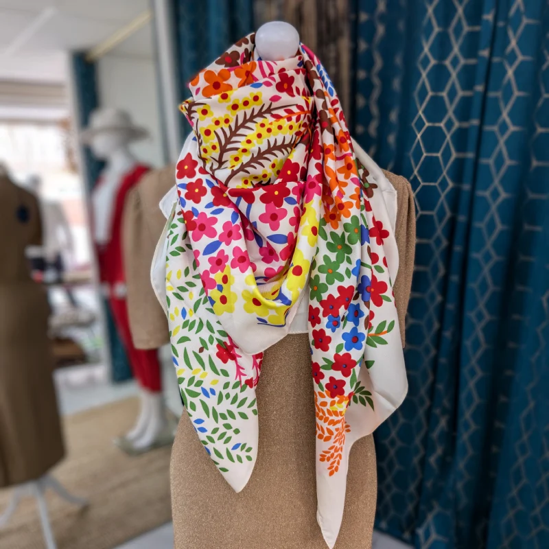 - Beige : Avec son fond beige, ce foulard offre une option plus neutre tout en restant chic. Les fleurs colorées ajoutent une touche de fraîcheur, rendant ce foulard parfait pour toutes les saisons.