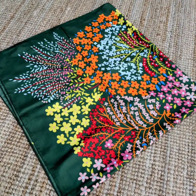 Découvrez notre collection de foulards en 100% viscose, d’une dimension généreuse de 130×130 cm. Ces accessoires de mode sont parfaits pour ajouter une touche de couleur et de style à n’importe quelle tenue. Avec quatre fonds de couleurs vibrantes, chaque foulard est orné de fleurs aux tailles et teintes variées, créant un look à la fois fleuri et coloré.