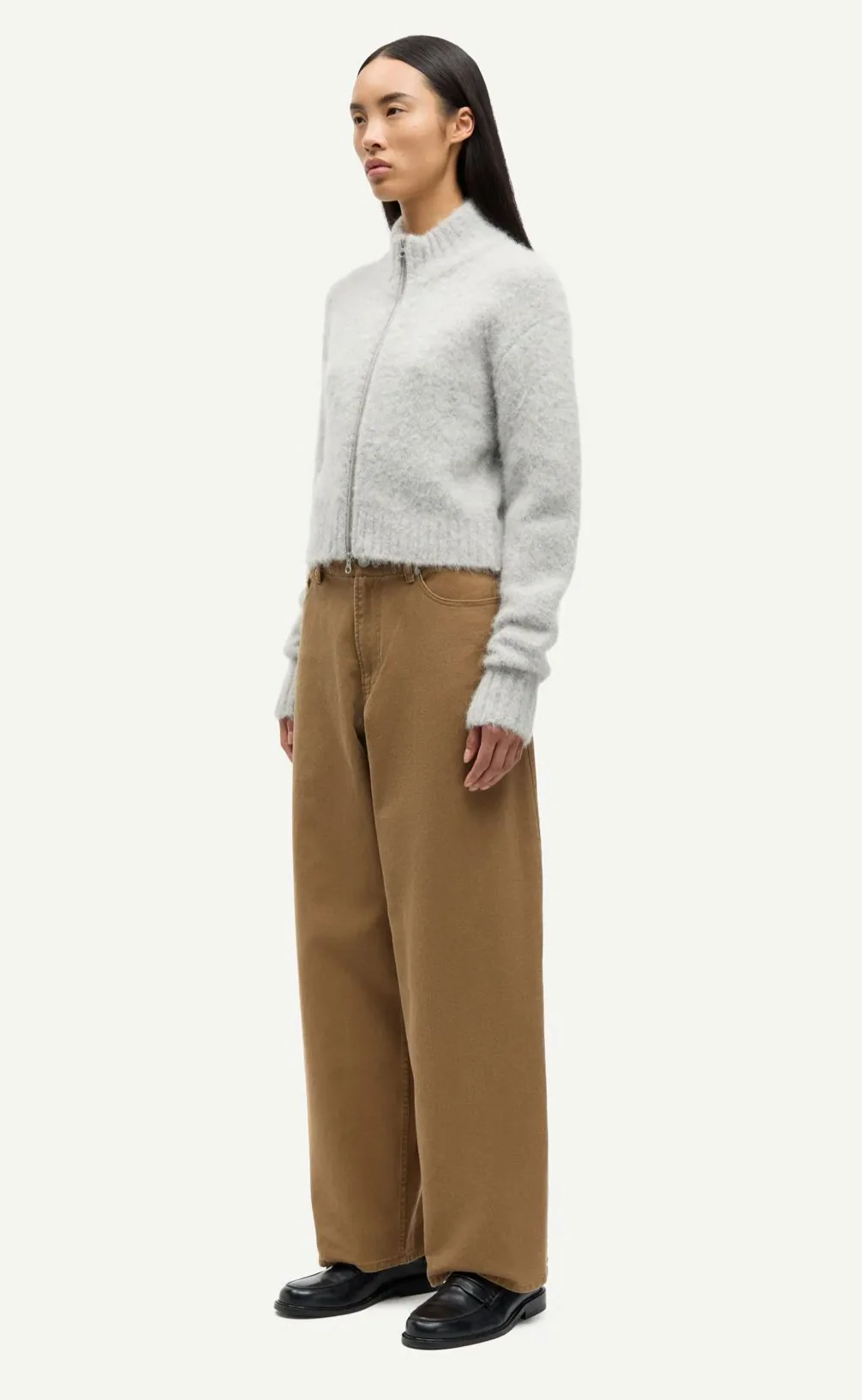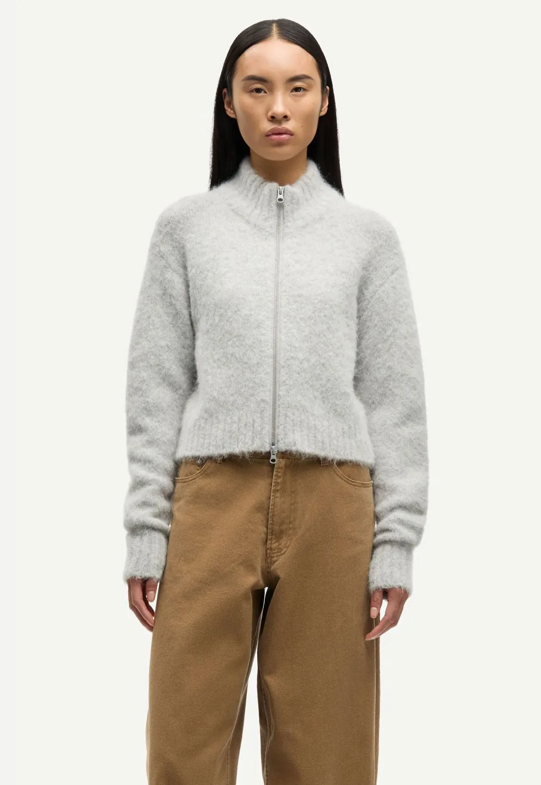 Cardigan en tricot, coupe classique. Fermeture zippée bidirectionnelle sur le devant. Col, poignets et ourlet côtelés. Col haut. Aspect brossé. Matière: mélange élastique à base d’alpaga. Clara mesure 1m74 et porte une taille S.