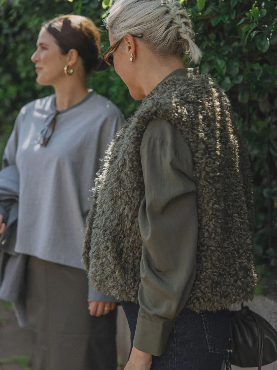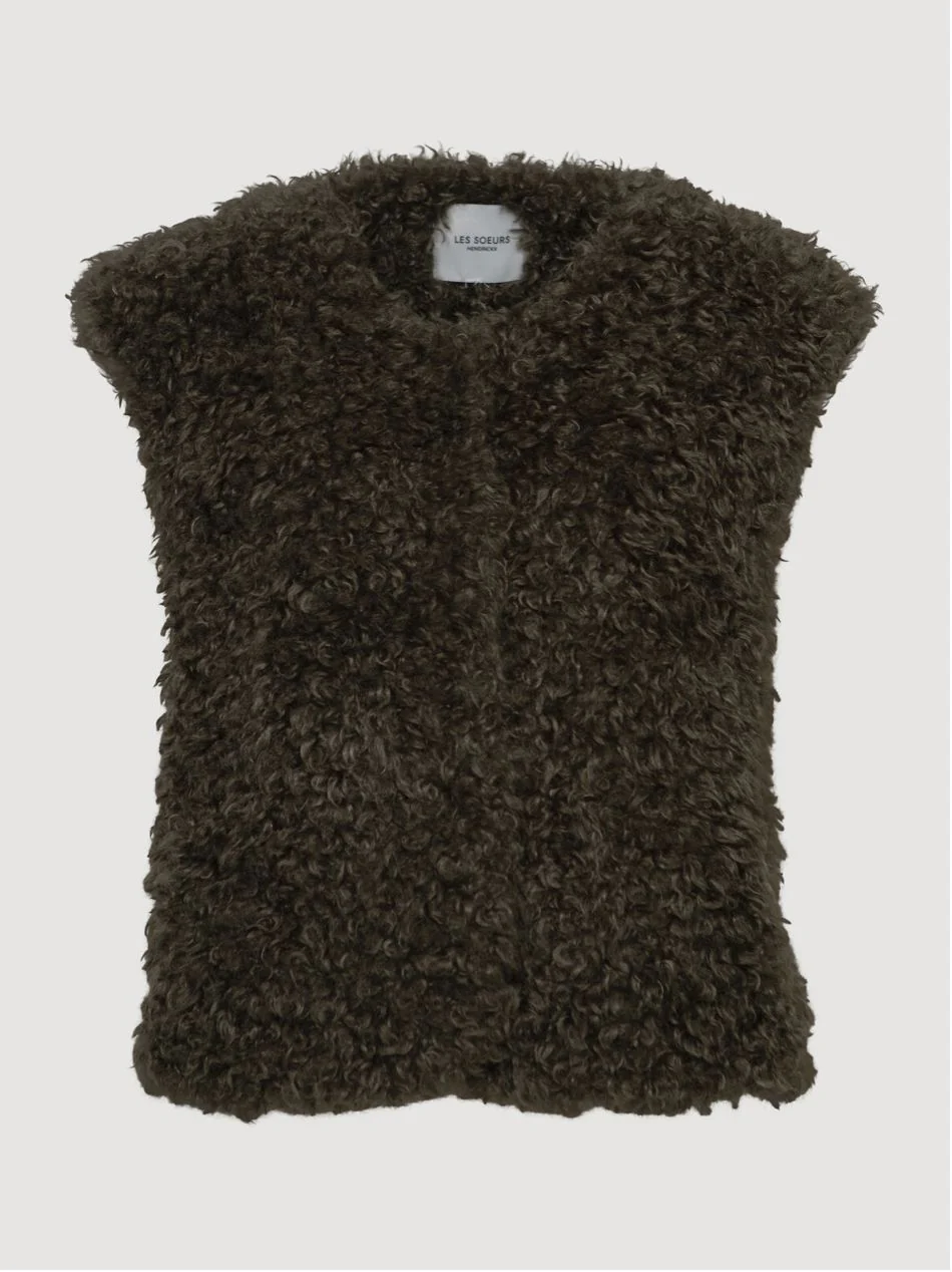 Gilet doux sans manches. Encolure ronde. Fermeture à pression devant. Deux poches passepoilées. Coupe ample.