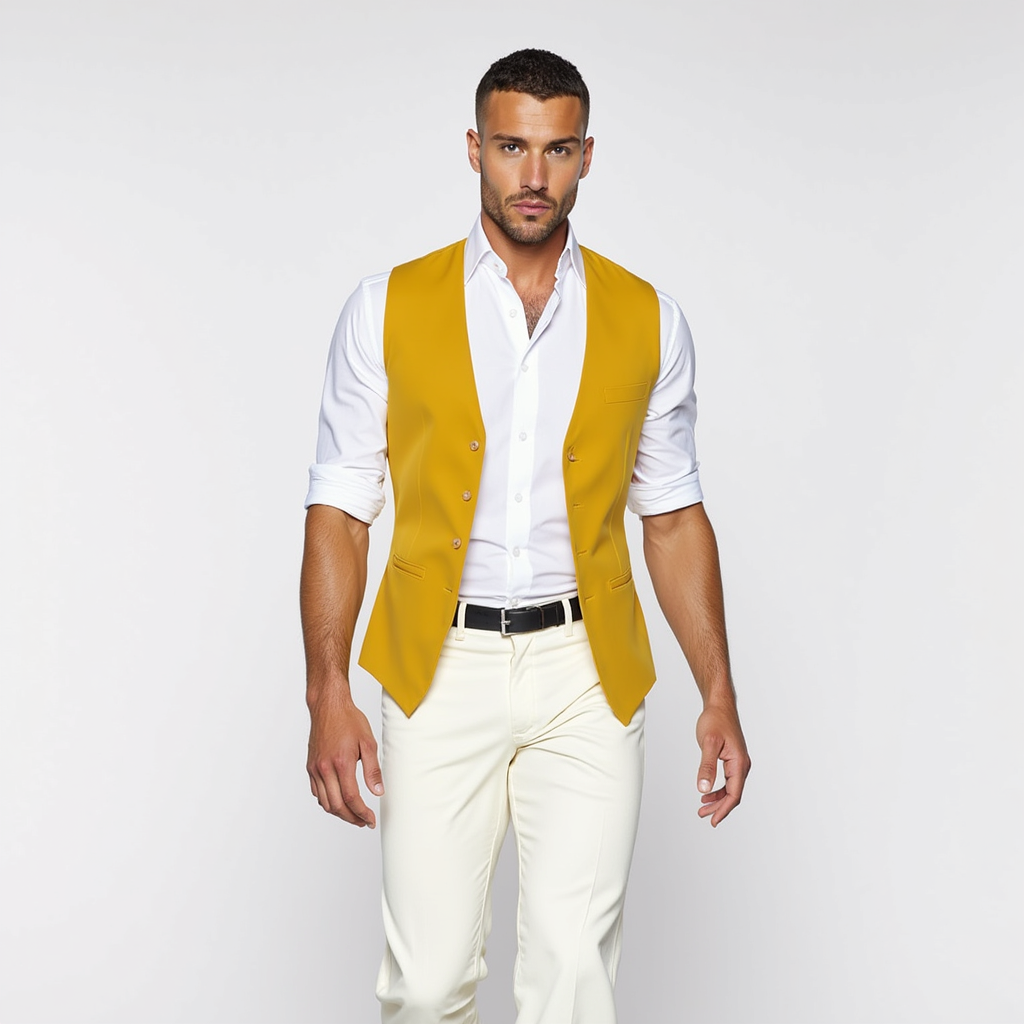 Le Gilet Prestige Soleil est la pièce parfaite si tu veux une tenue habillée avec une vraie touche de caractère. Son jaune vibrant apporte instantanément de l’énergie et un côté élégant mais audacieux, idéal pour marquer les esprits lors d’un mariage, d’une soirée ou d’un événement.