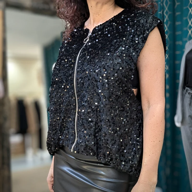 Fabriqué en velours luxueux, ce gilet est orné de sequins scintillants qui ajoutent une touche festive et glamour. Que vous assistiez à un dîner en famille, une soirée entre amis ou une fête élégante, ce gilet saura vous mettre en valeur tout en vous offrant un confort optimal. Son design unique permet de le porter facilement par-dessus une blouse ou une robe, créant ainsi un look chic et sophistiqué.