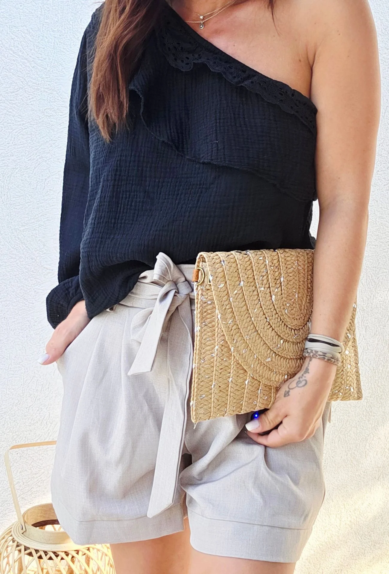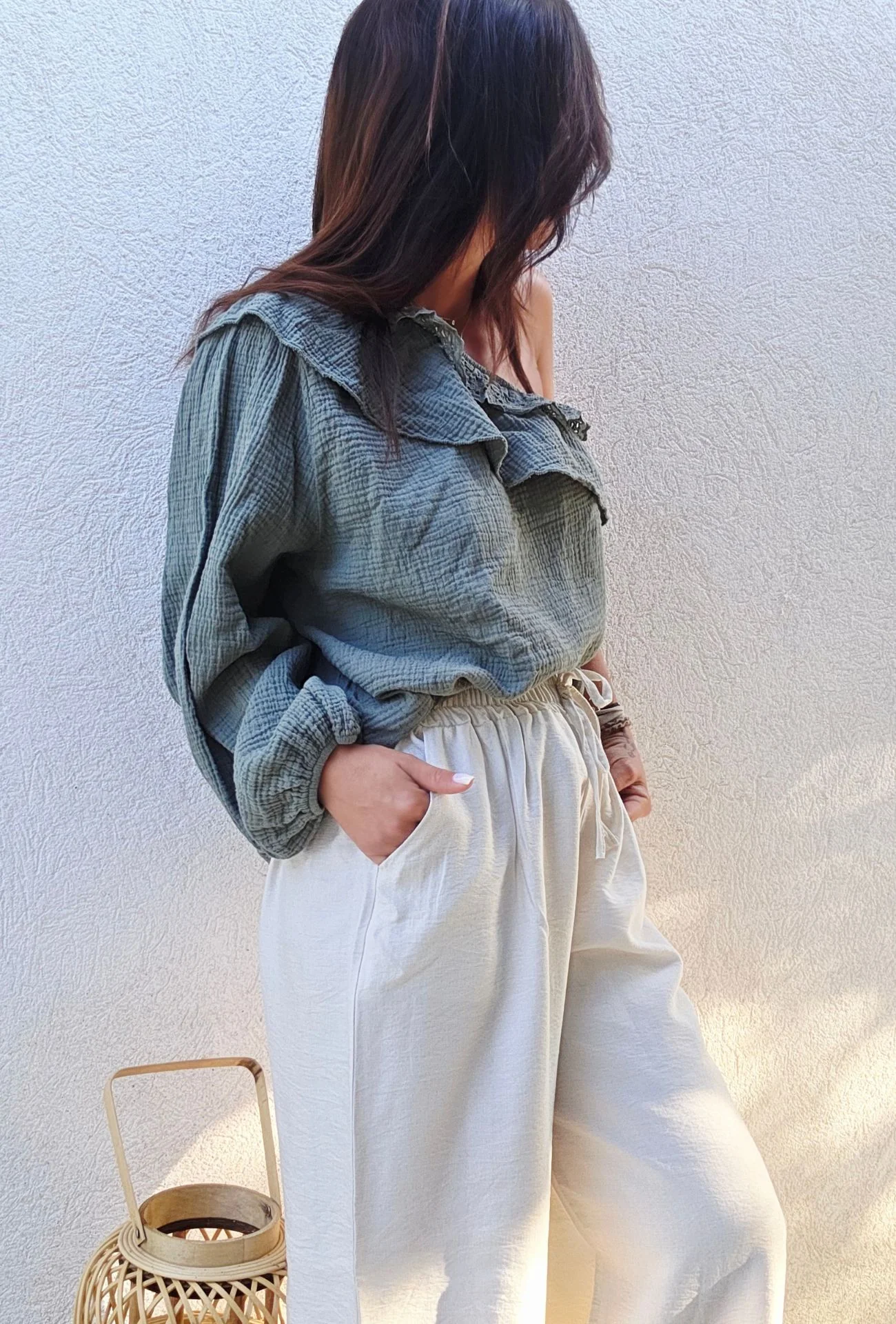 Conseil de style : Pour un look coordonné et élégant, associez le haut en gaze de coton 1 manche CATHY avec le Pantalon en Gaze de Coton CATHY. Si vous préférez un style plus léger, vous pouvez également opter pour le Short en Gaze de Coton CATHY. Complétez votre tenue avec un chapeau en paille et des sandales plates pour un look estival décontracté, ou des bottines pour une touche plus audacieuse. Ajoutez des accessoires comme un panier en paille ou des bijoux dorés pour parfaire votre ensemble.