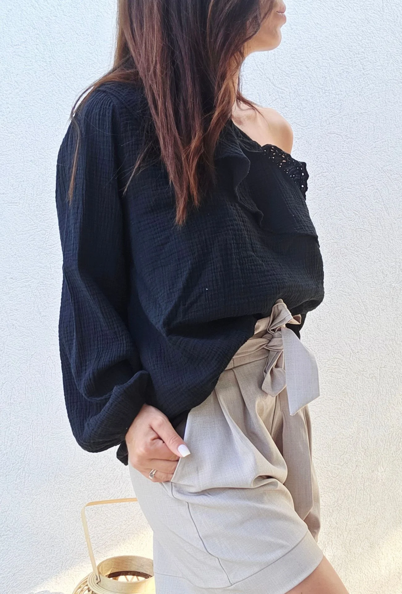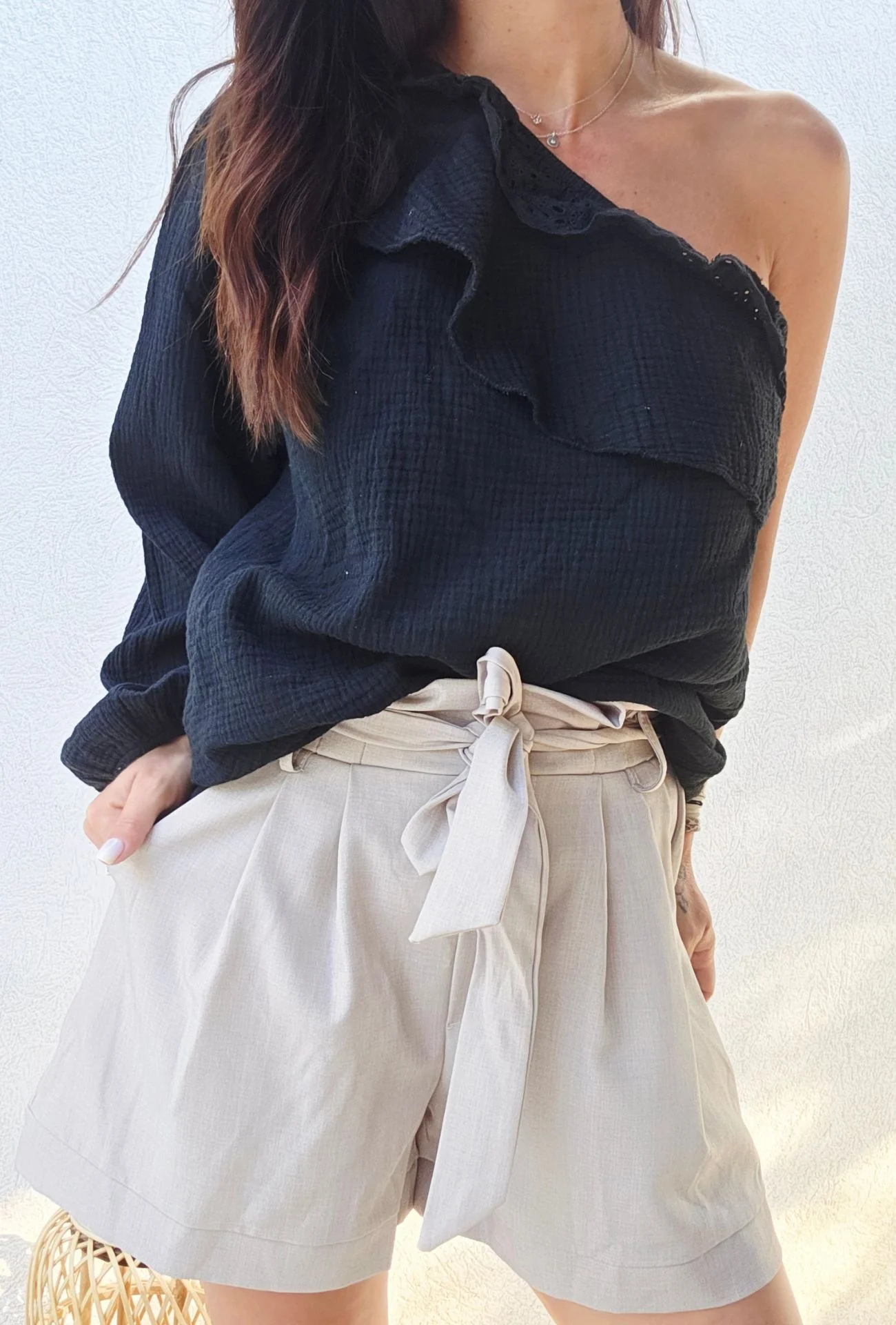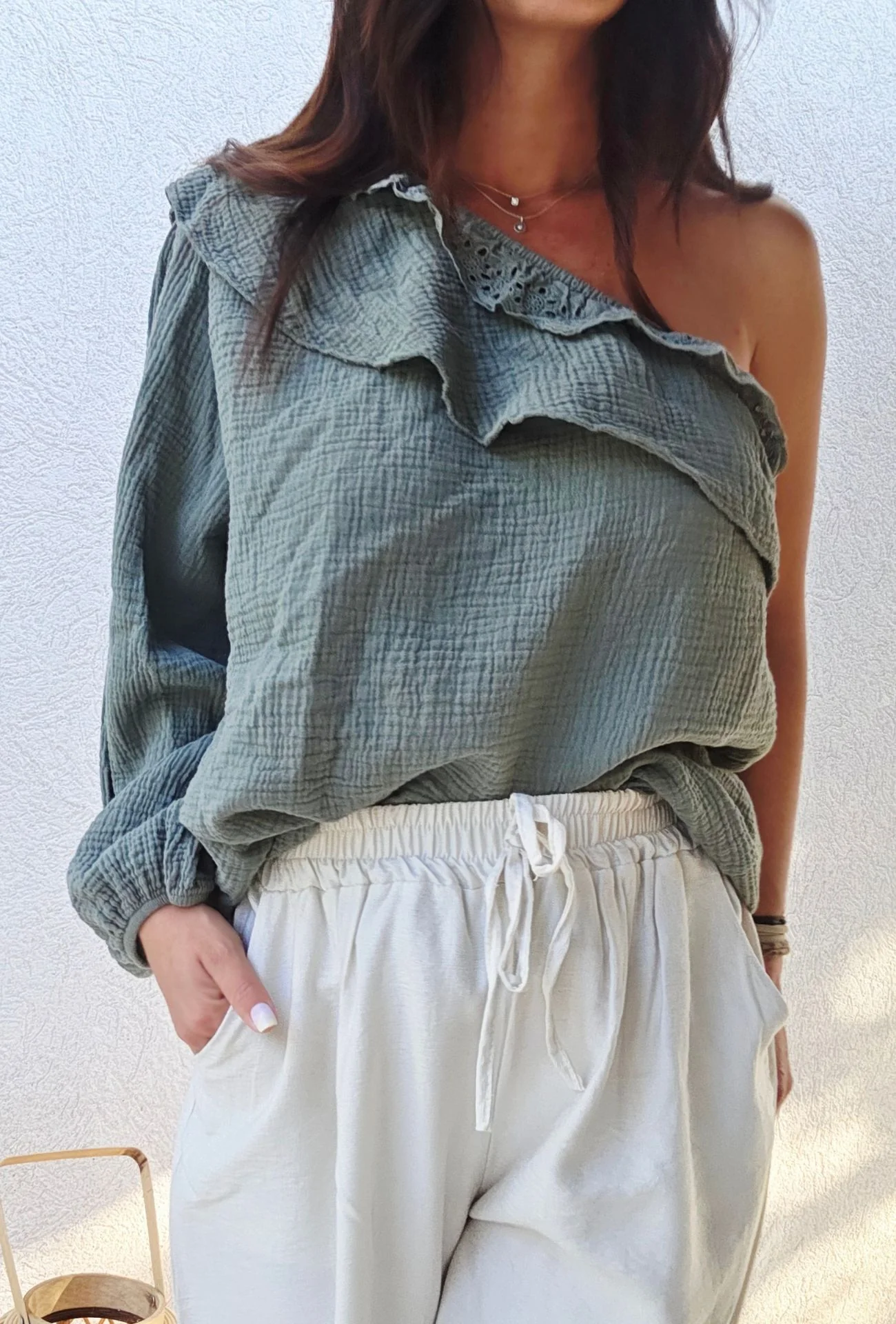 Description : Ajoutez une touche d’élégance bohème à votre garde-robe avec le haut en gaze de coton 1 manche CATHY. Fabriqué à 100% en coton, ce haut léger et aéré est parfait pour les journées ensoleillées. Avec son design asymétrique et ses volants délicats, il offre un look à la fois chic et décontracté. Disponible en trois couleurs tendance – Sable, Kaki et Noir – ce haut s’adapte facilement à tous les styles.