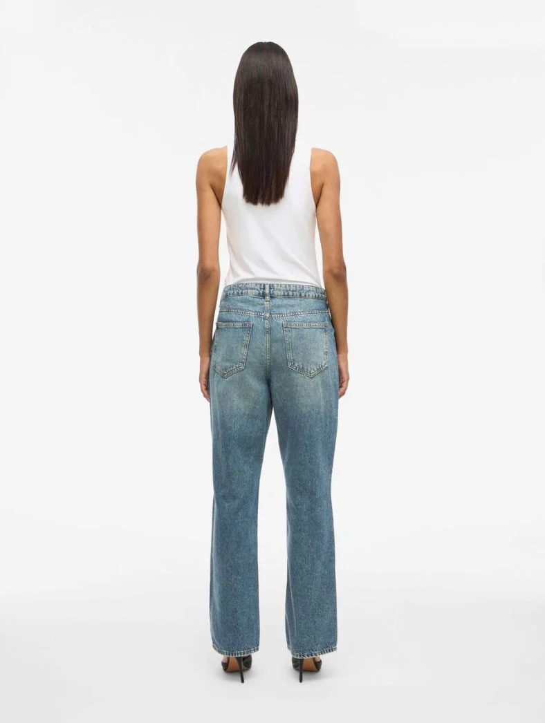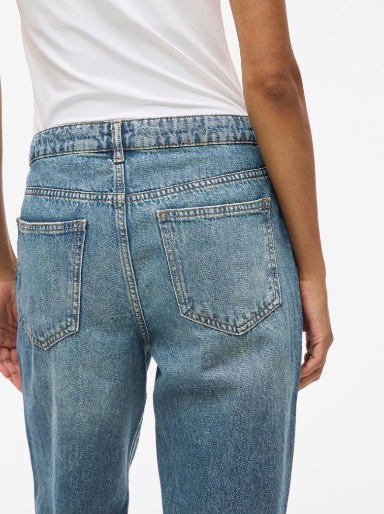 Jean décontracté. Taille basse. Fermeture éclair et boutons. Poches avant et arrière. Passants de ceinture.