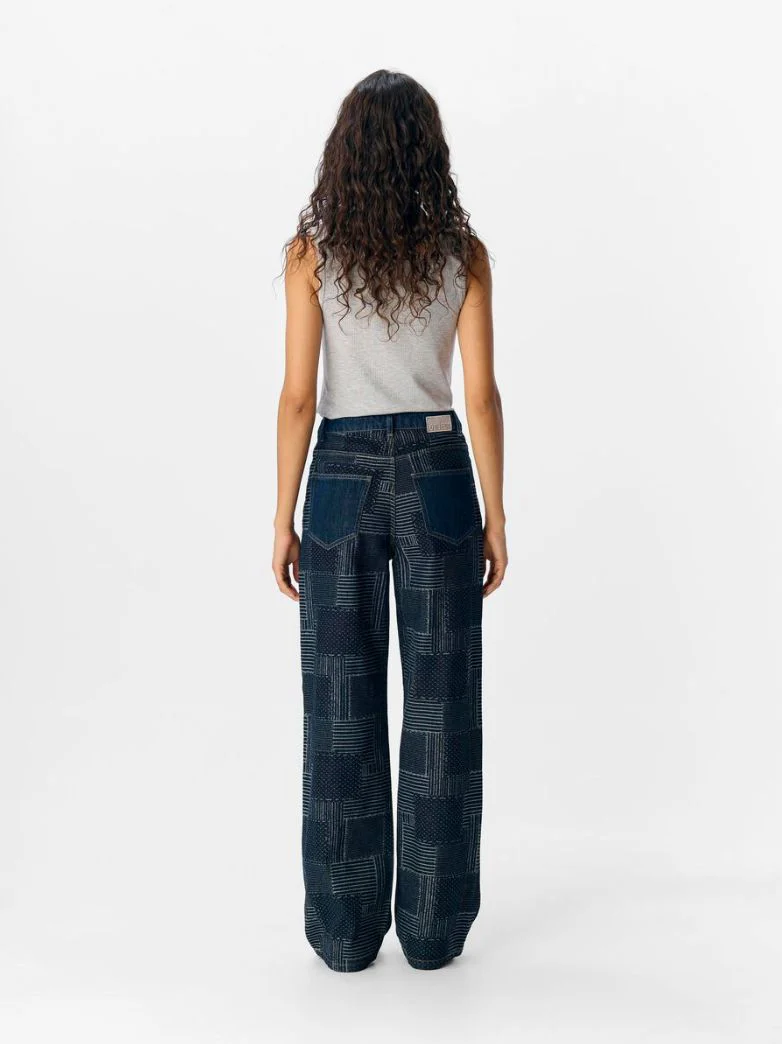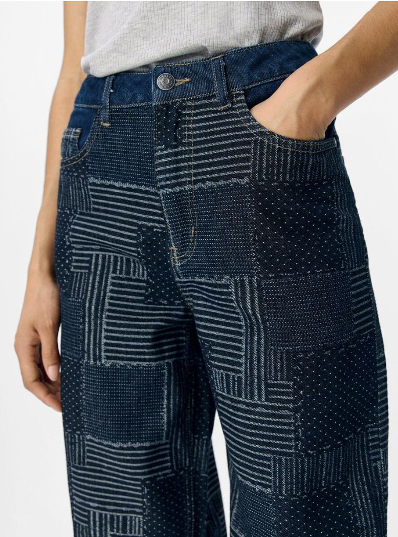 Jean large à motif patchwork. Taille mi-haute. Passants de ceinture. Modèle à 5 poches. Braguette zippée surmontée d’un bouton riveté. Coupe ample.