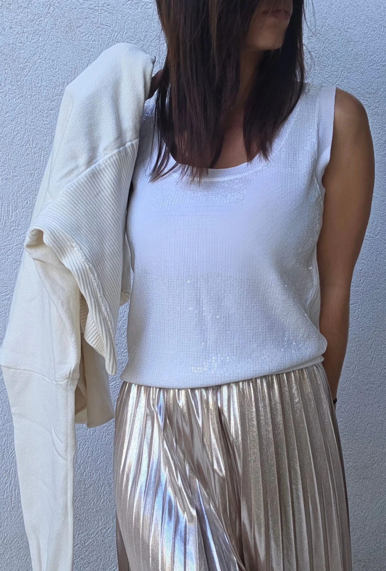 Portez-la avec un débardeur blanc pour un contraste lumineux ou osez le total look métallisé pour une soirée chic. Complétez votre tenue avec des sandales à talons ou des baskets blanches pour une allure plus casual.