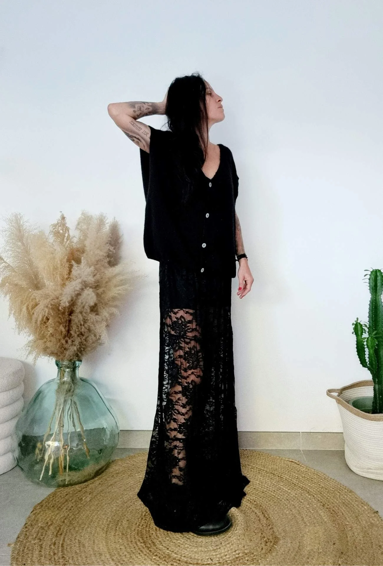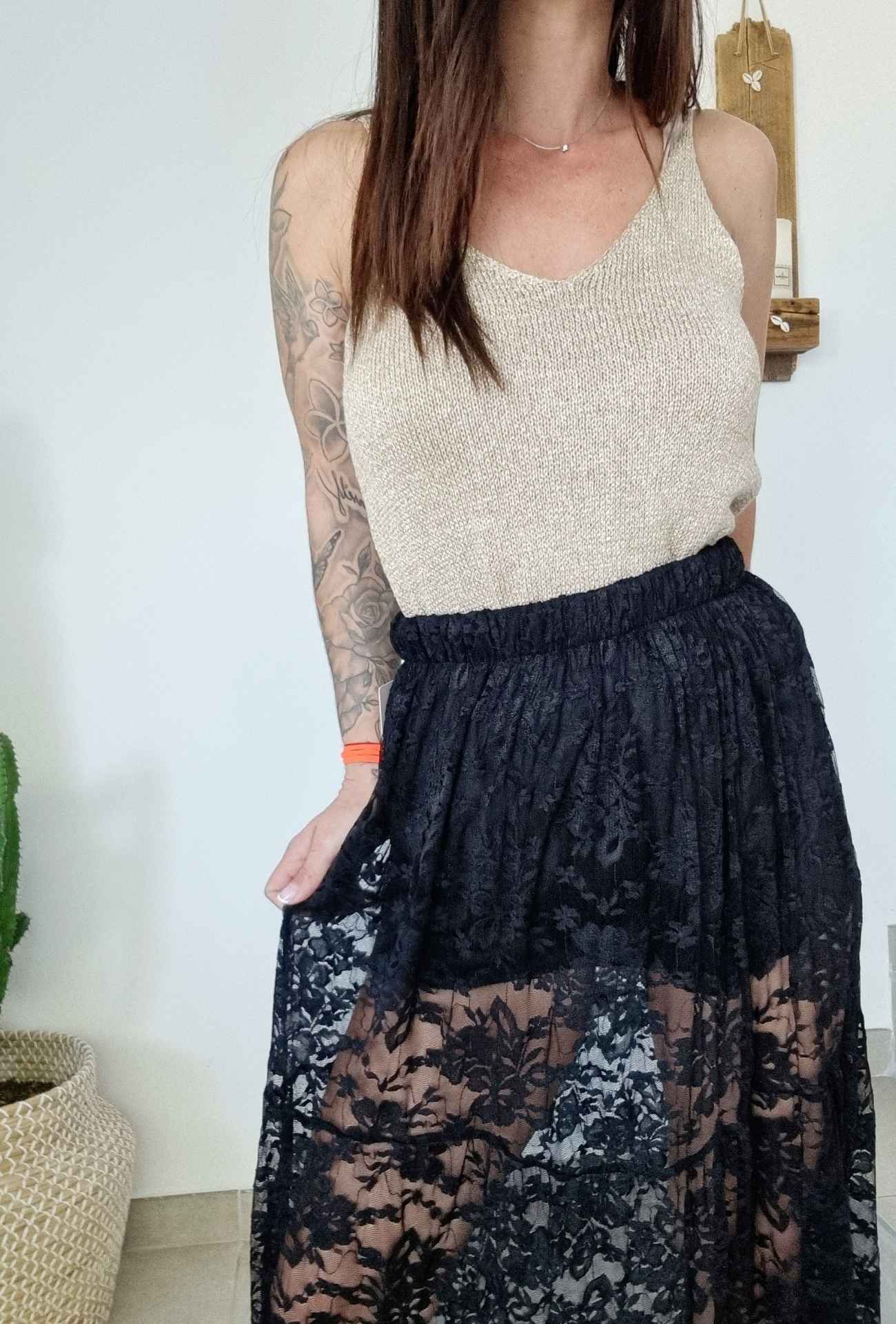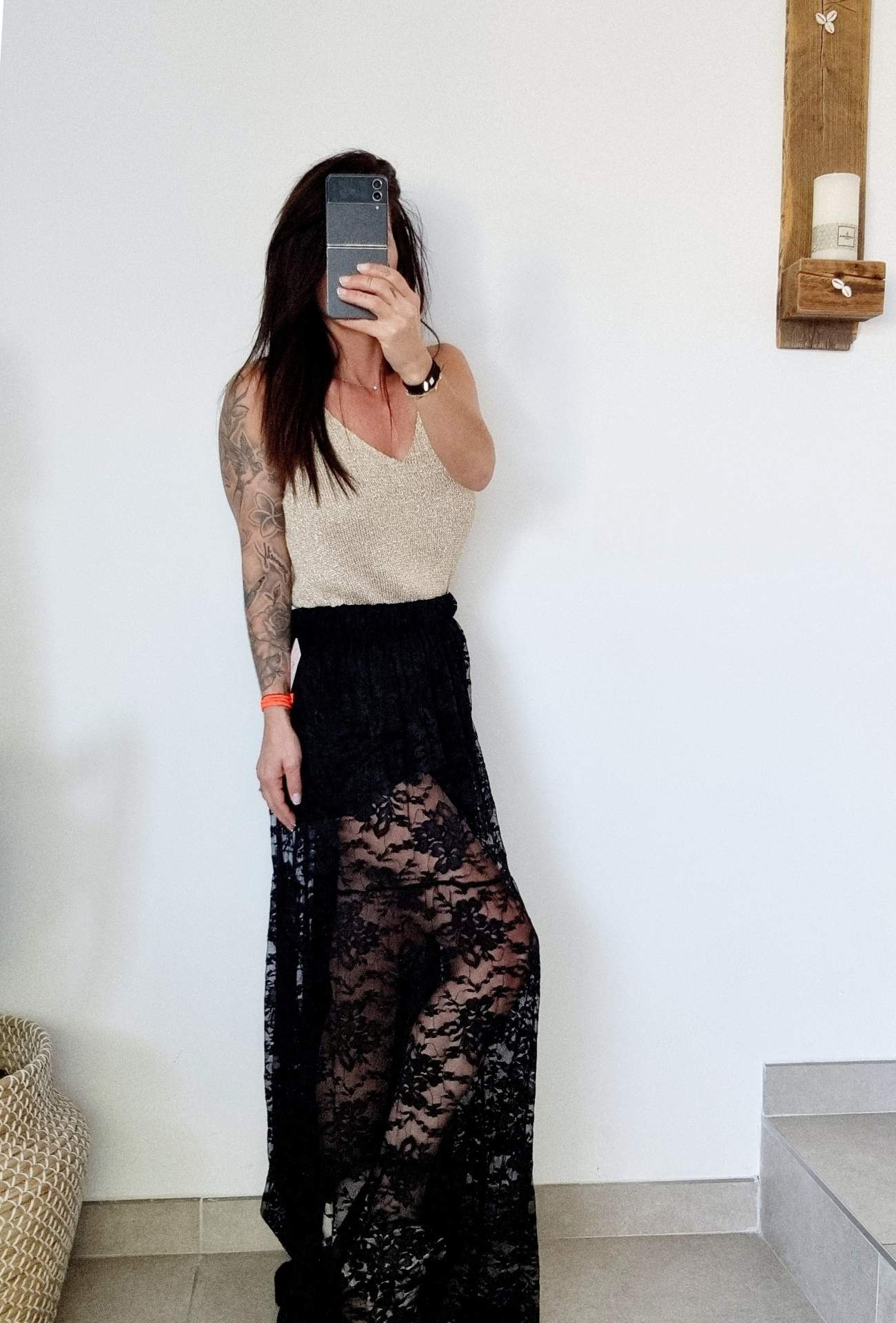 La jupe CELIA est un must-have pour celles qui cherchent à apporter une touche de mystère et de sophistication à leur garde-robe. Sa coupe longue et son jeu de transparence en font une pièce captivante, parfaite pour une soirée ou pour un style boho-chic en journée. Elle s’associe aussi bien avec un top glamour qu’avec un pull cosy pour un look contrasté.