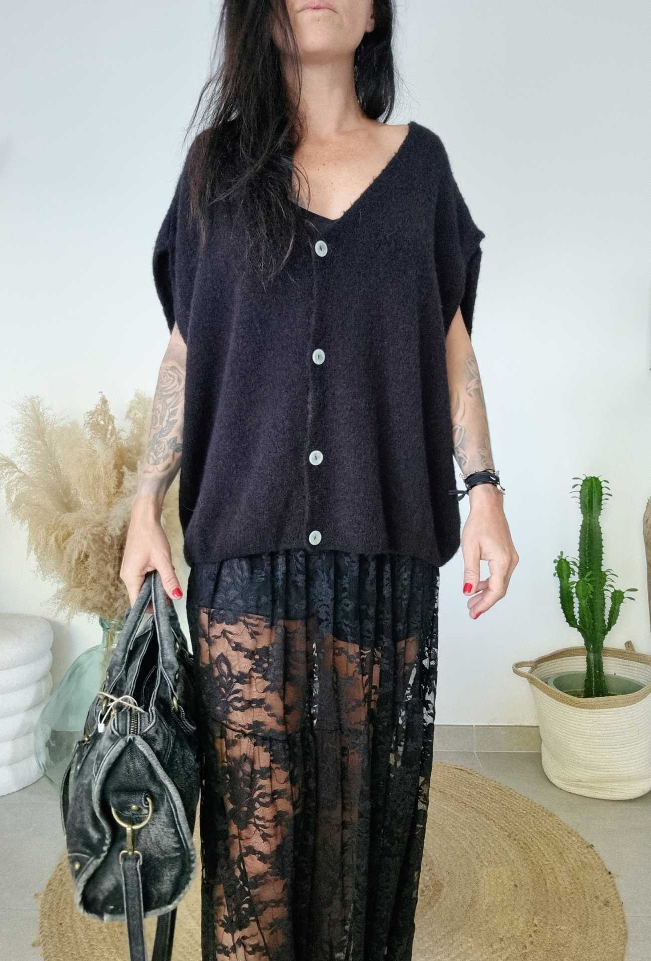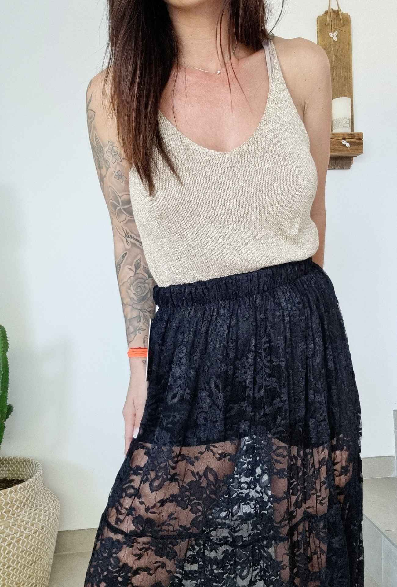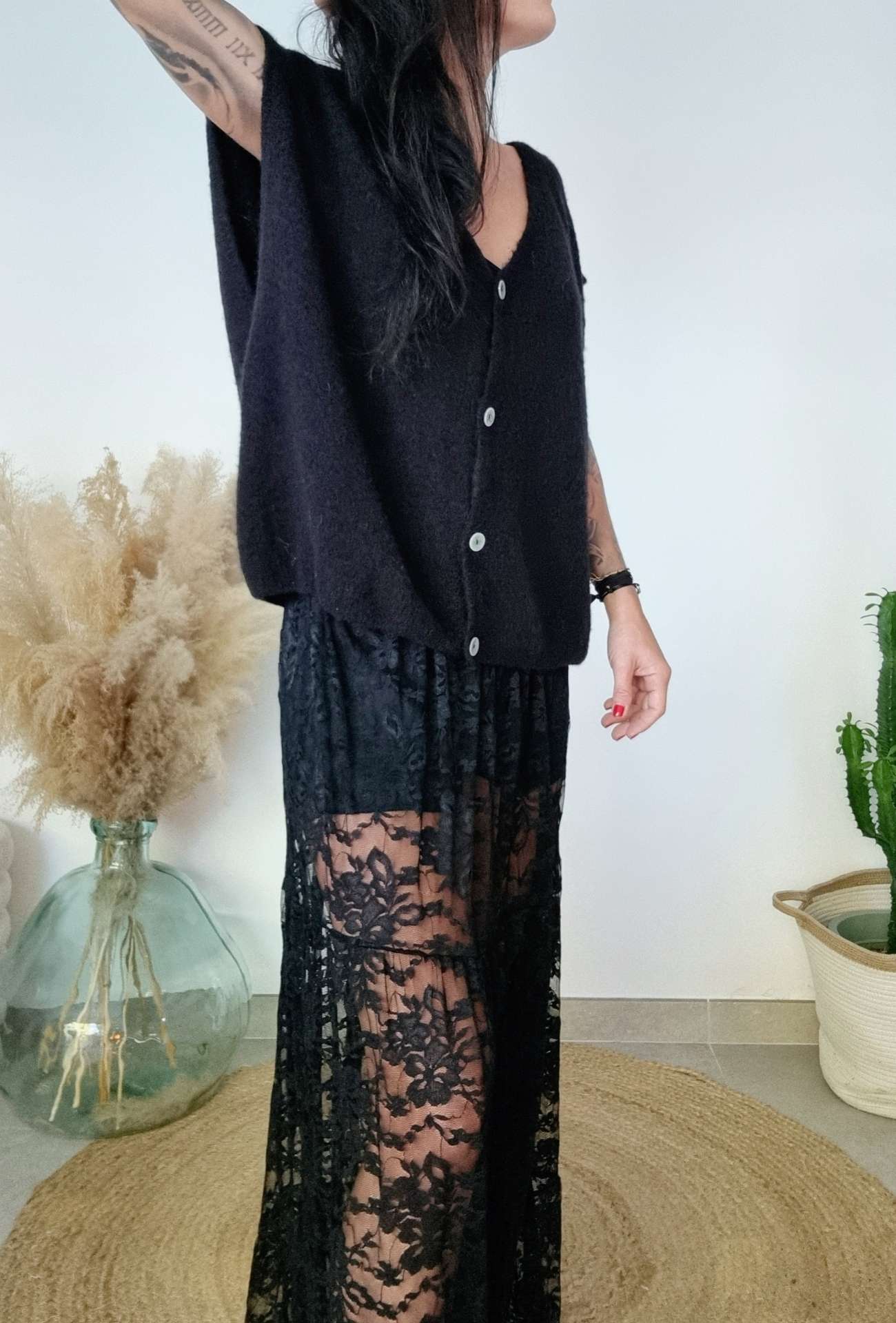 La jupe CELIA est un must-have pour celles qui cherchent à apporter une touche de mystère et de sophistication à leur garde-robe. Sa coupe longue et son jeu de transparence en font une pièce captivante, parfaite pour une soirée ou pour un style boho-chic en journée. Elle s’associe aussi bien avec un top glamour qu’avec un pull cosy pour un look contrasté.