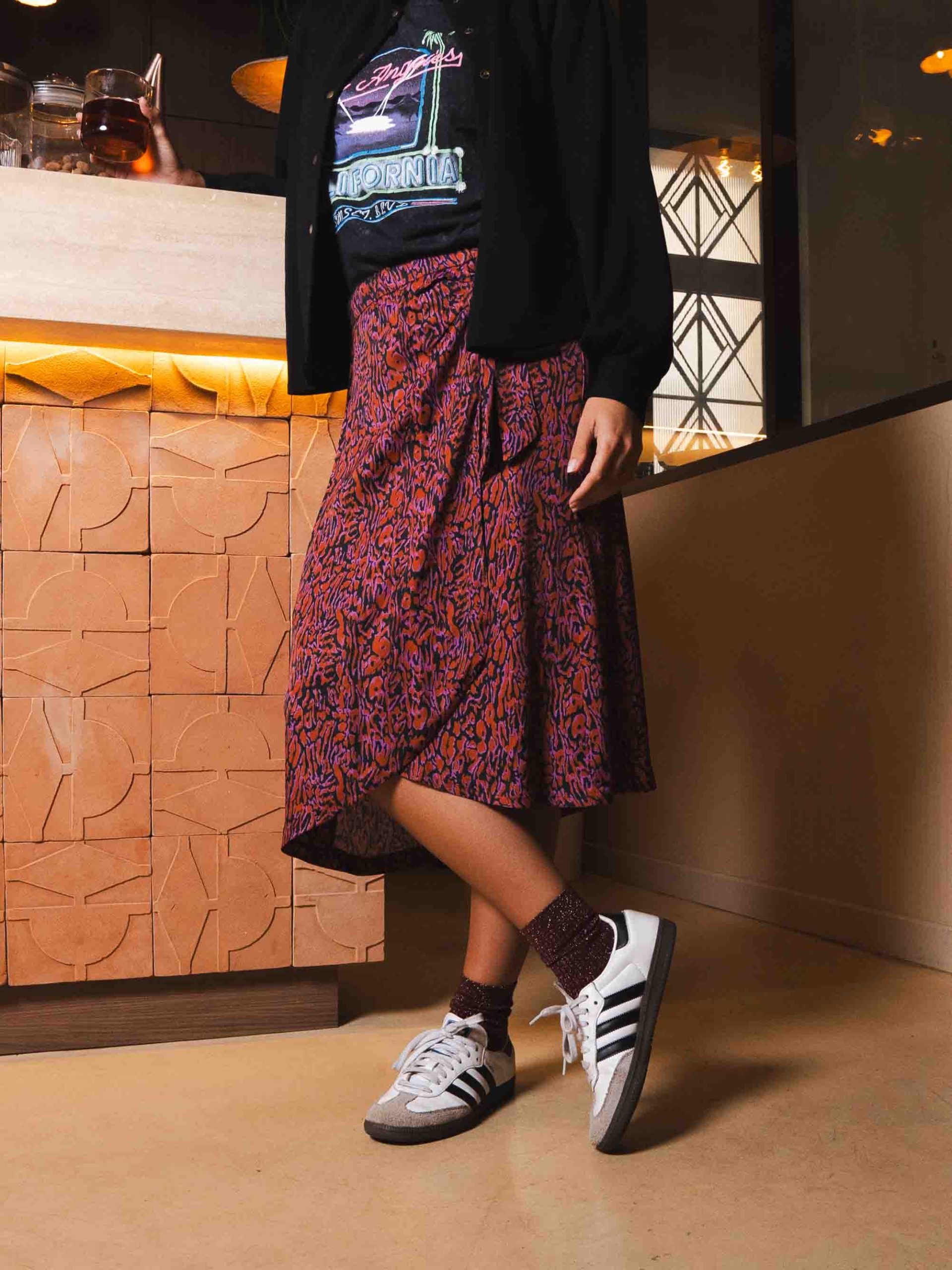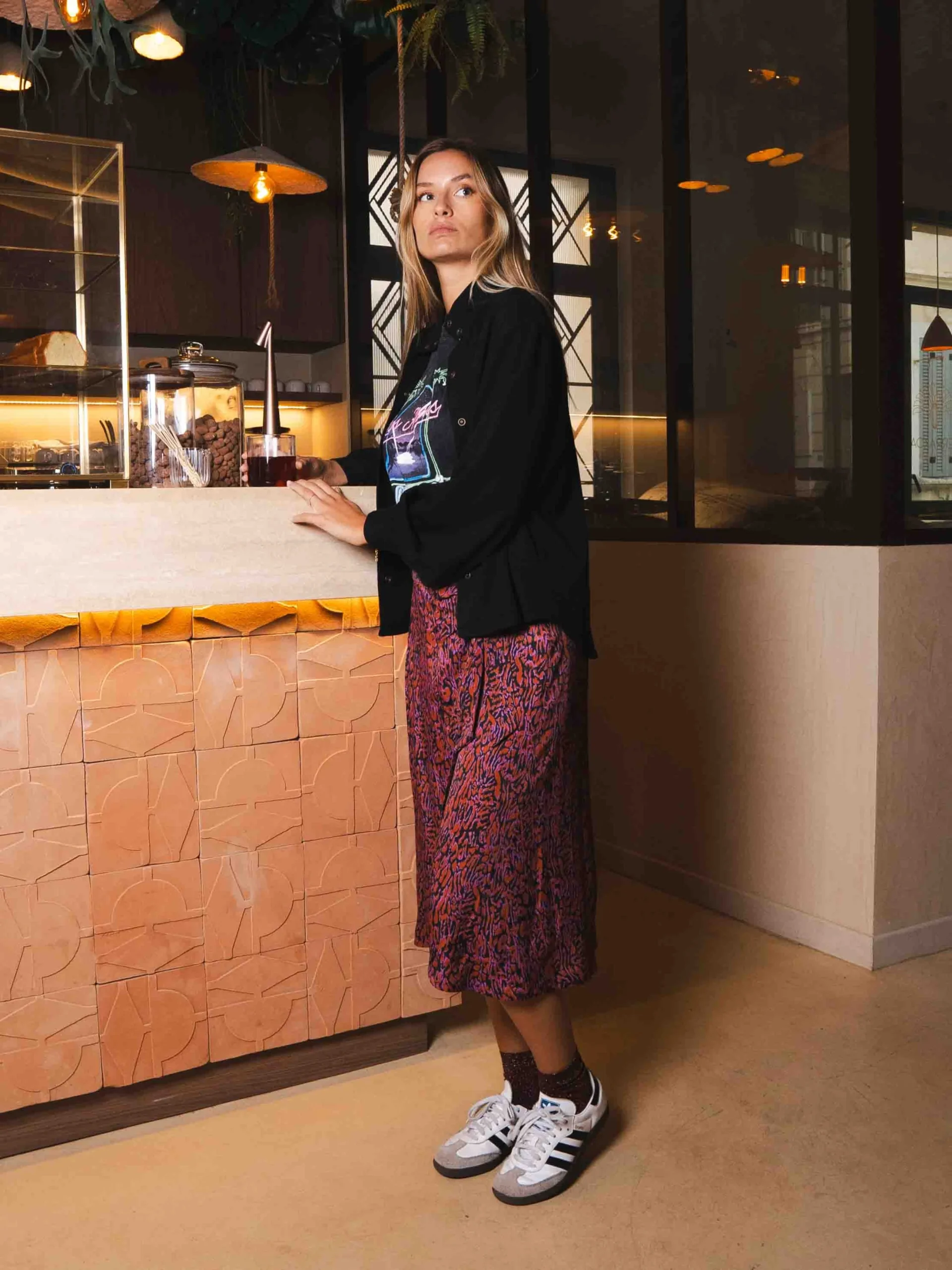 La jupe SIERRA, disponible en noir ou en viscose satinée à motif exclusif, présente une coupe légèrement ajustée et une longueur mi-mollets. Elle est dotée d’une taille élastiquée à l’arrière et d’une ceinture plate à l’avant, ainsi qu’une attache à la taille qui sublime la silhouette tout en offrant un confort optimal.