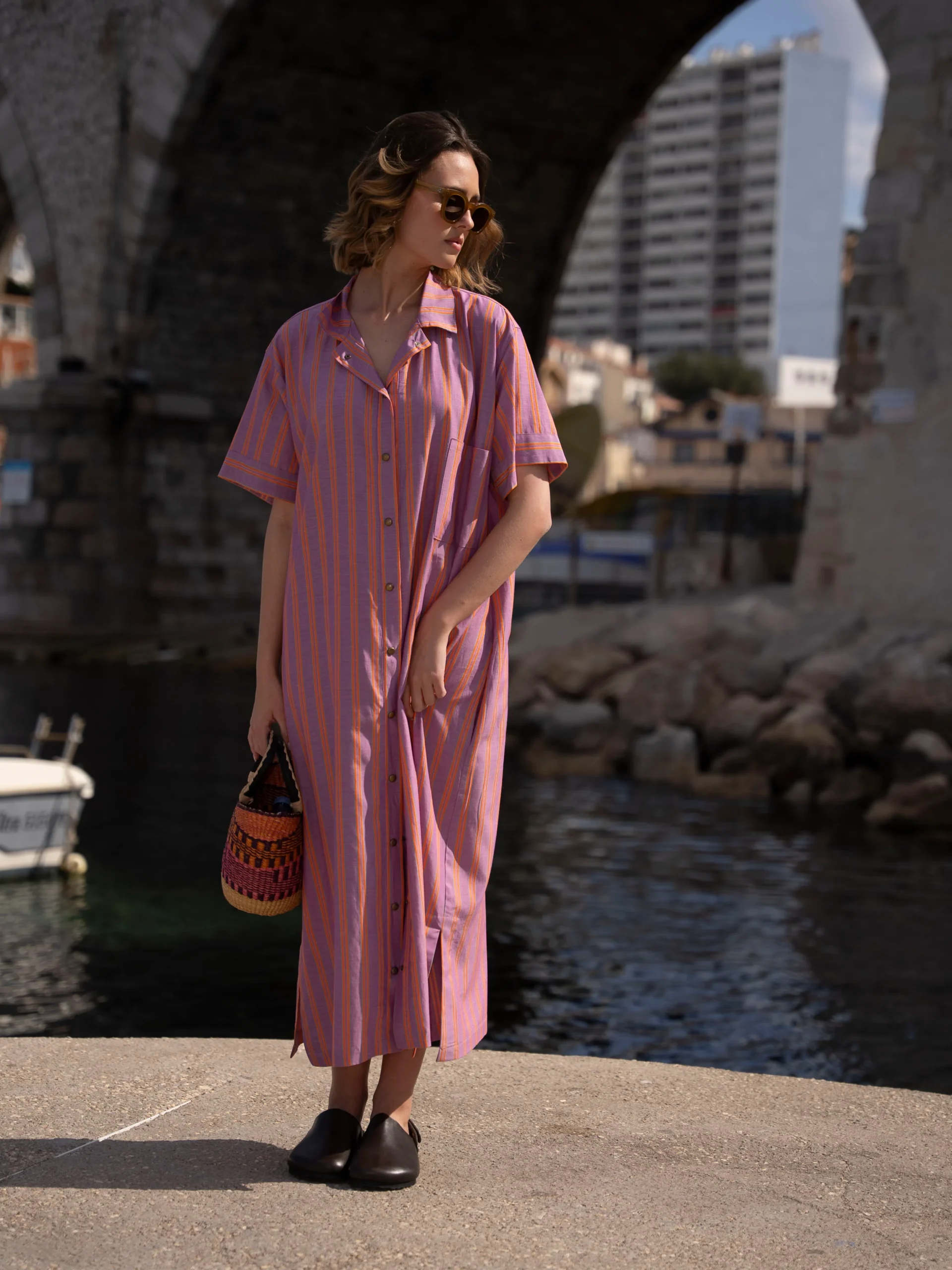 Légère, colorée et fluide, la robe FRAGOLA est l’alliée parfaite des journées ensoleillées. Sa coupe droite et ample, son col chemise décontracté et ses manches courtes apportent un style casual-chic sans effort.