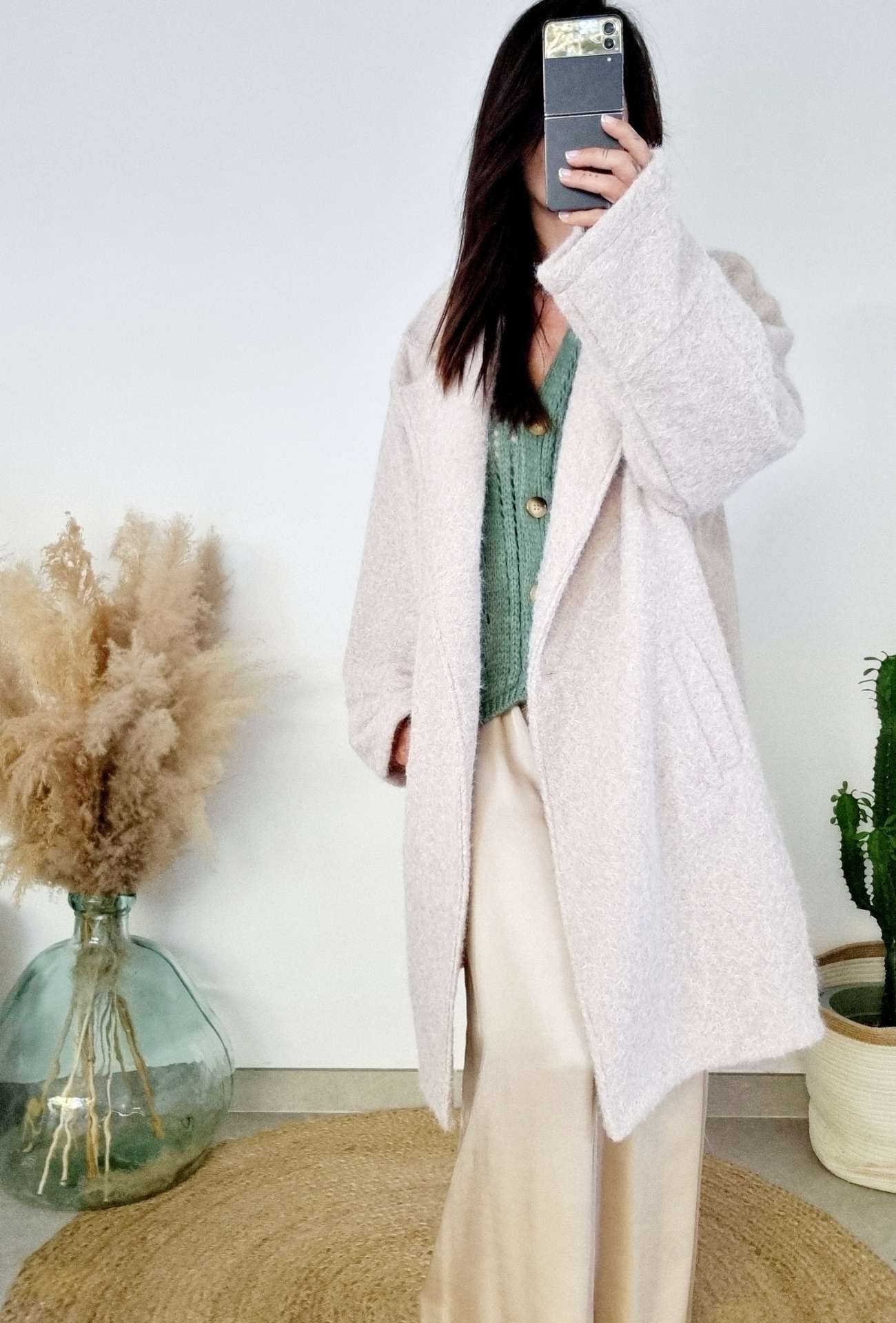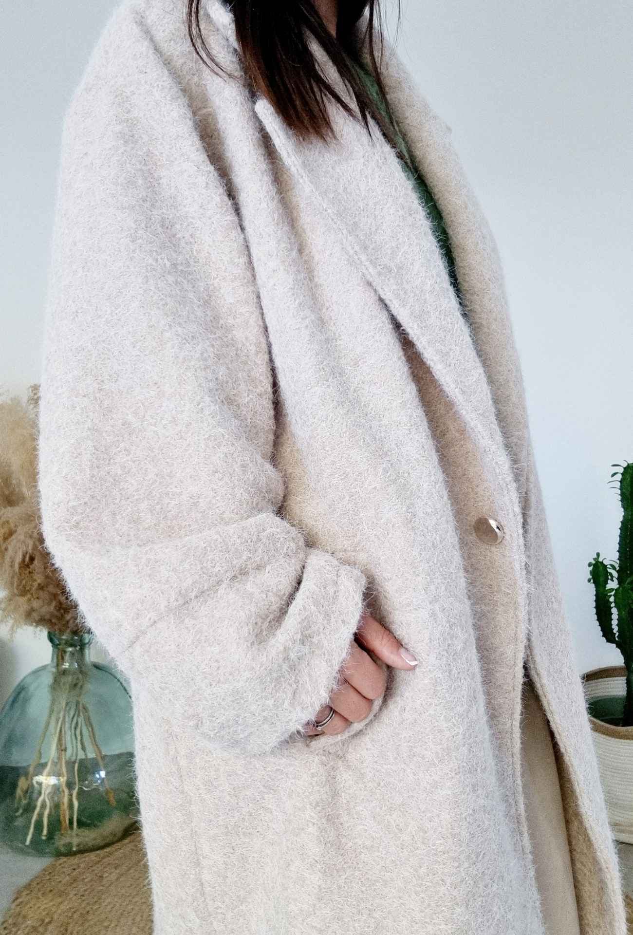Le manteau Chiara est la pièce cocooning par excellence pour celles qui recherchent à la fois confort et raffinement. Sa coupe oversize et sa couleur beige douce ajoutent une touche sophistiquée à vos looks d’hiver. C’est un manteau qui se démarque par son style cosy et minimaliste, idéal pour des tenues habillées comme décontractées.