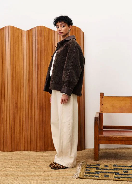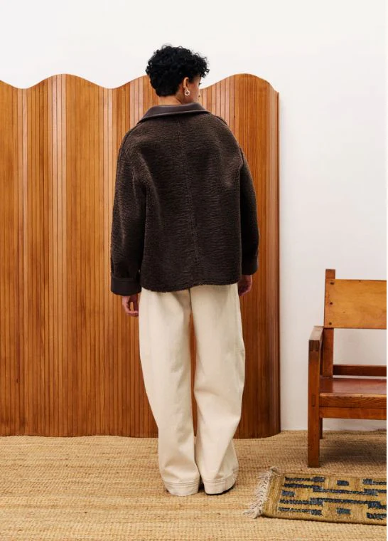 Manteau court. Coupe droite et courte. Tissu Exclusif FRNCH. Manches longues. Fermeture à boutons. Deux poches. Tissu chaud bouclettes. Col chemise.