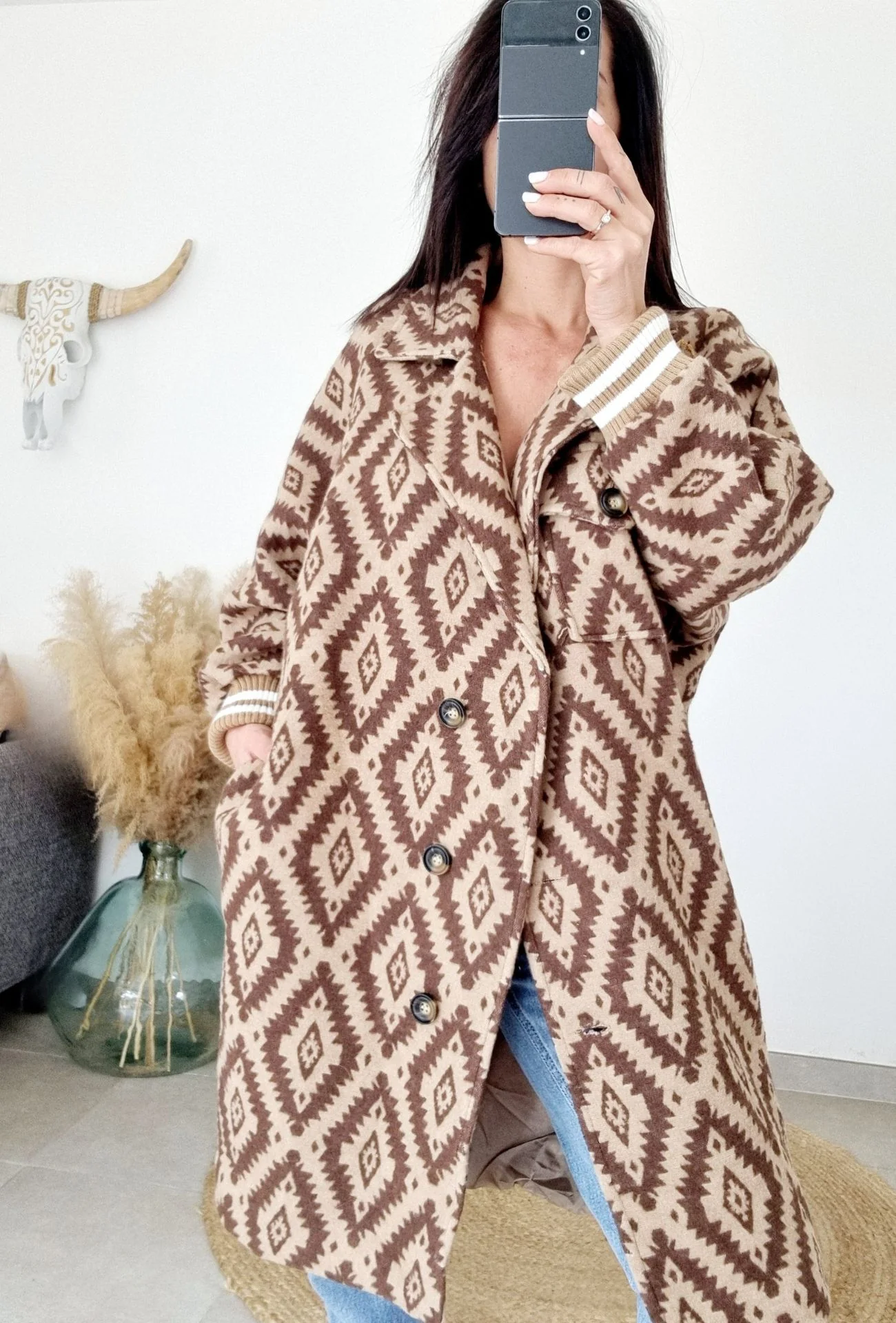 Le manteau GIPSY en marron est la pièce bohème-chic idéale pour affronter les journées fraîches avec style. Son motif ethnique et ses tons naturels apportent une touche de caractère et d’originalité à vos tenues. Avec sa coupe oversize et ses boutons contrastants, il offre une allure à la fois élégante et décontractée. Parfait pour un look tendance et confortable.