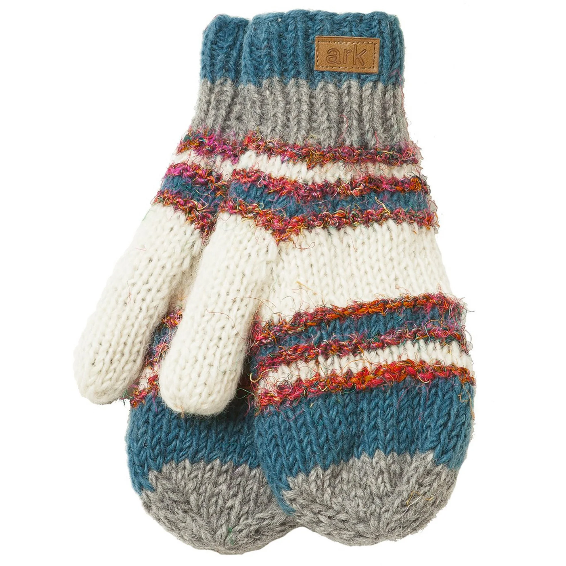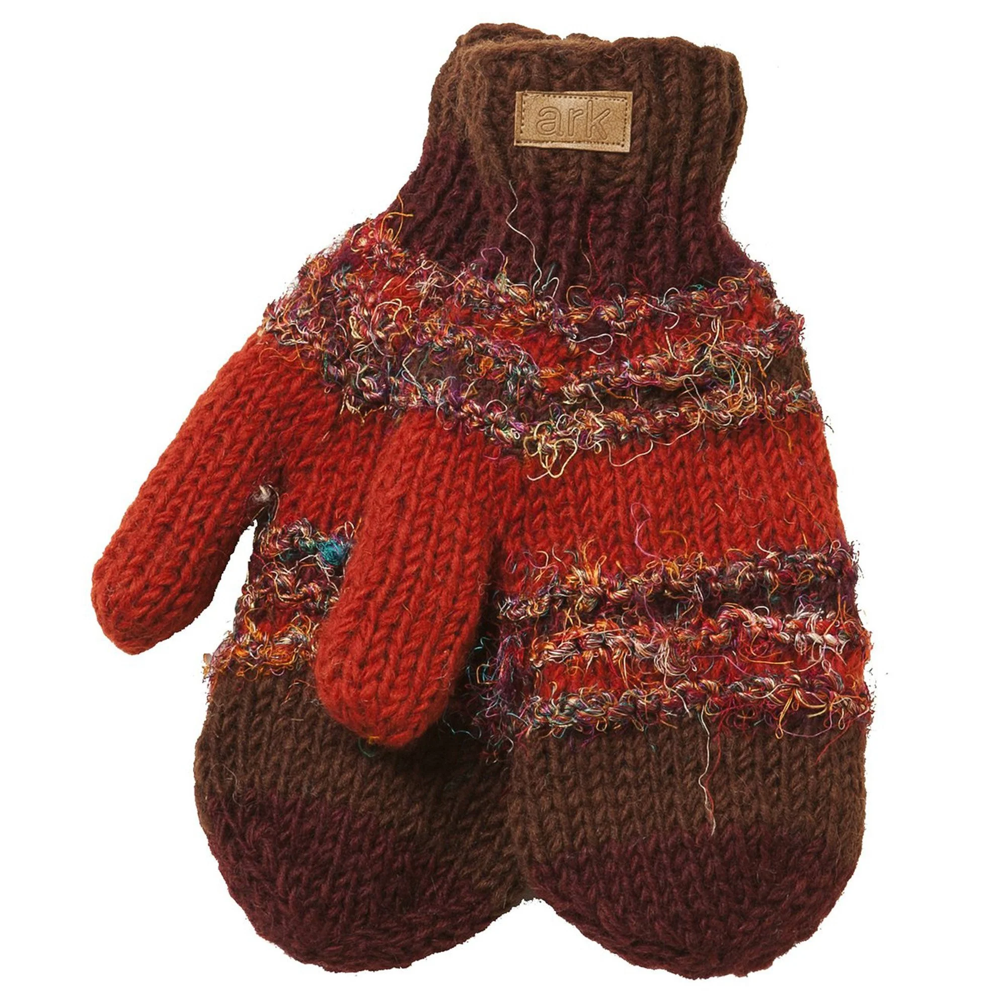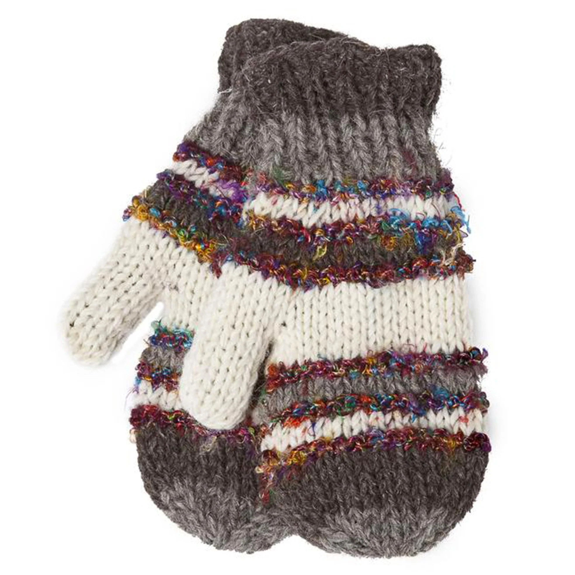 Mitaines 100% laine, adornées de soie recyclée sont doublée de polar pour confort accru. Ces gants sont tricoté à la main au Népal. Taille unique et unisexe.